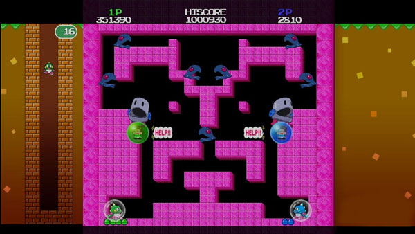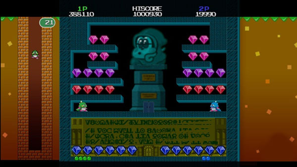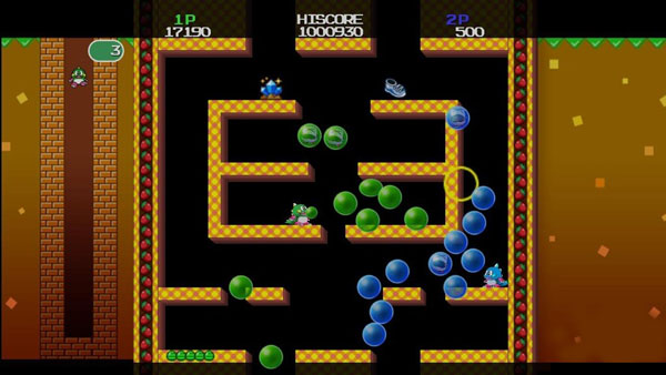 defeat them. Like the original, there are quite a bit of items to assist you in defeating your foes from boots of speeds to bombs and lots of items to collect to boost up your high score. The game does allow up to four players to play the new levels in Bubble Bobble (no online support unfortunately) and these levels are quite diverse and sometimes more claustrophobic than the original which makes for some interesting gameplay. With the new levels, angles sometimes take centre stage which did make us raise an eyebrow when we first saw it. Another cool feature of the new levels is that you can even trap your friends in bubbles which is great for hogging the bonuses and fruit in the game.