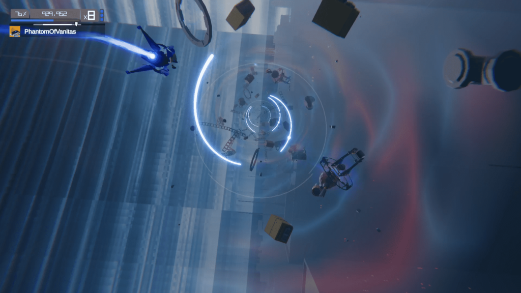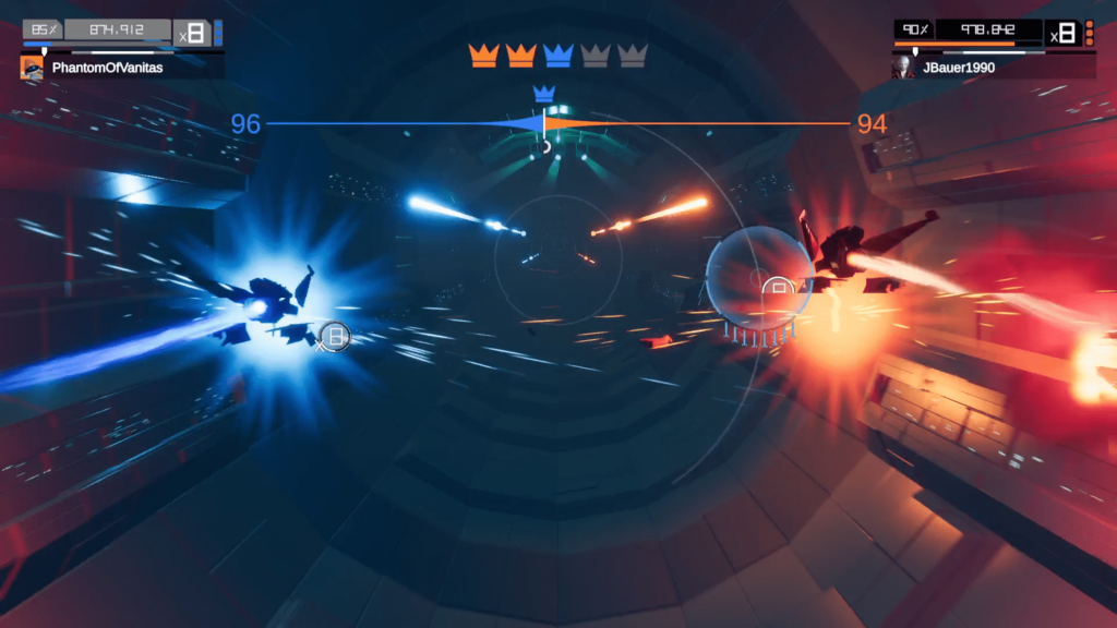 Multiplayer is the sequel’s most substantial expansion over the original game. Two-player co-op and PvP modes are available both locally and online, and they meaningfully recontextualize the core mechanics. Co-op divides ribbons and enemies by color, forcing communication and spatial awareness as both players share the same song and environment. PvP is even more compelling, breaking levels into scoring segments where performance earns crowns that multiply final scores. This structure ensures that victory isn’t decided by a single mistake but by consistent accuracy and control throughout an entire track. While single-player remains the heart of Aaero2, multiplayer adds longevity and a welcome sense of shared rhythm.