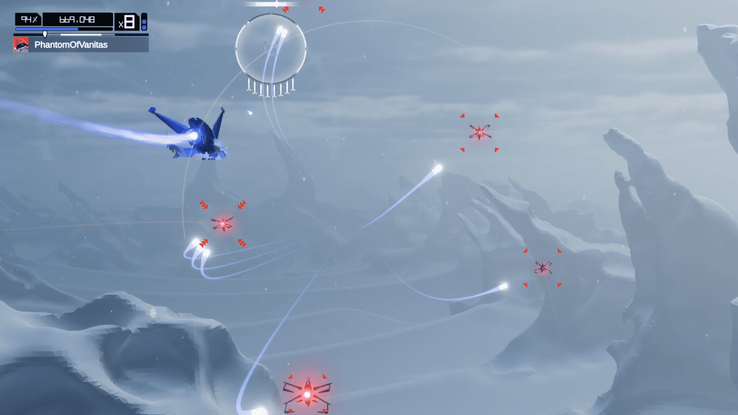 Combat plays a much more prominent role than it did in the original game, for better and occasionally for worse. The right stick controls aiming, while holding and releasing the trigger locks on and fires missiles. Timing these releases on the beat instantly reloads empty missile slots, encouraging rhythmic precision and rewarding confident play. A secondary gatling-style weapon, activated with the left trigger, handles smaller enemies but is governed by a heat meter that can leave you briefly vulnerable if mismanaged. Individually, these mechanics are strong, but it’s their interaction that defines Aaero2’s challenge. Juggling ribbon accuracy, enemy fire, weapon heat, and rhythmic missile timing can feel overwhelming at first, yet once it clicks, the game opens up into a deeply satisfying loop where every successful run feels earned. Chaining actions builds combos that physically transform your ship, providing a clear visual representation of skill progression that’s both functional and stylish.