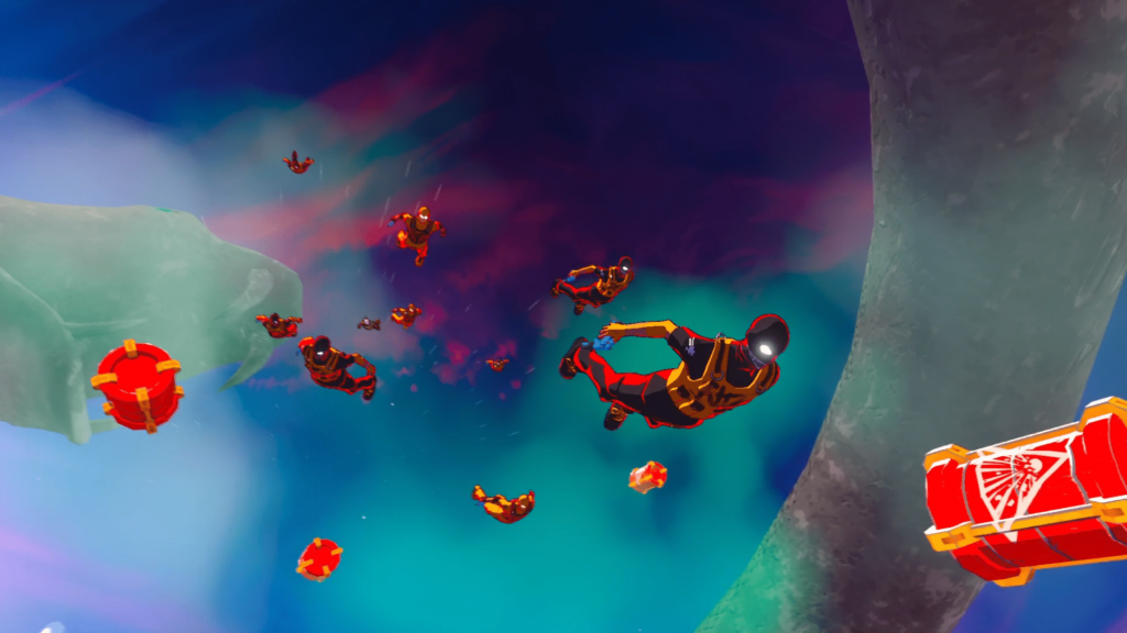 Gameplay revolves around constant motion. Each level begins with Smoke diving out of a plane and immediately entering freefall. You cannot stop, slow down, or turn the dive into anything resembling traditional movement. Instead, the game becomes a forward facing shooting gallery where positioning, timing, and awareness matter just as much as precision aiming. Enemies fall alongside you, obstacles drift into your path, and floating islands, lasers, and environmental hazards force you to stay alert at all times. Slipstreams act as temporary speed boosts, pushing you forward faster before easing you back to your normal falling pace. The goal is always to survive the descent, clear threats, and reach the island below while maintaining efficiency.