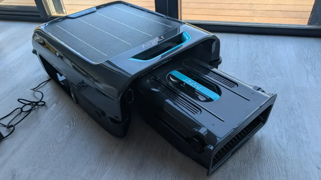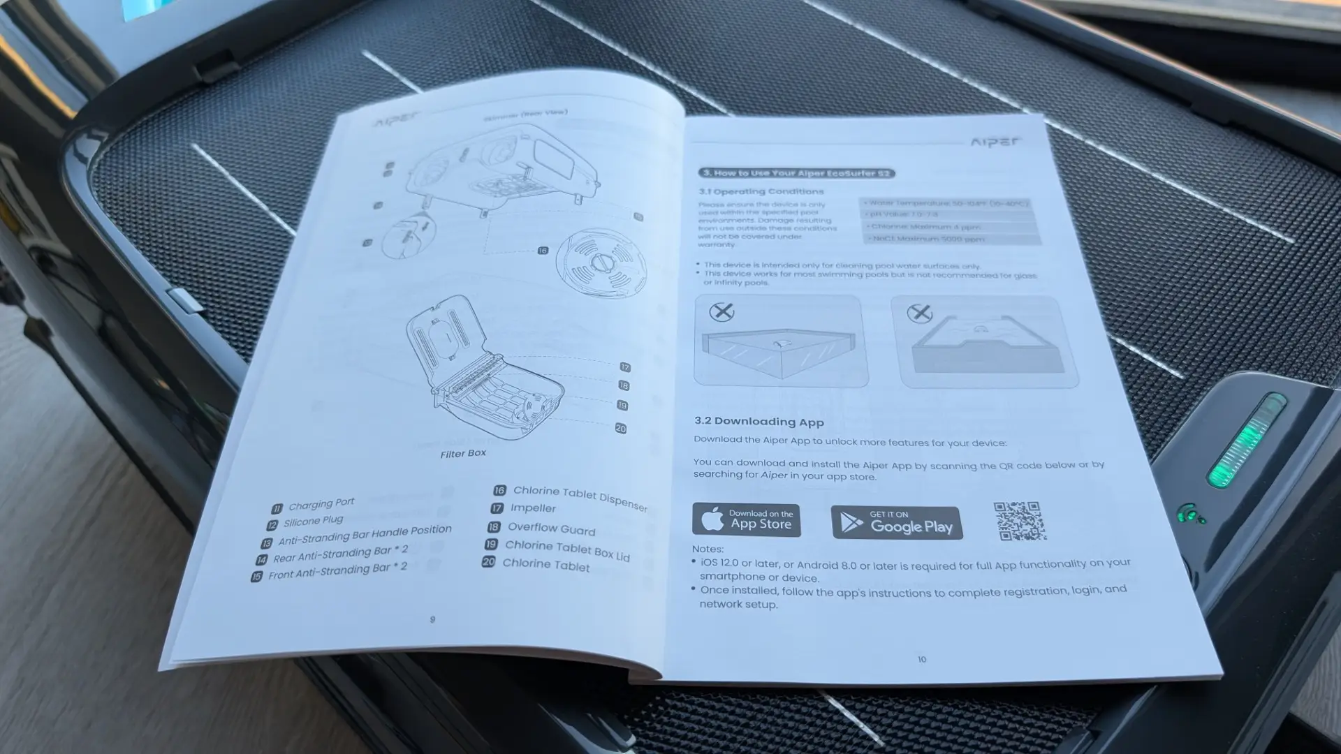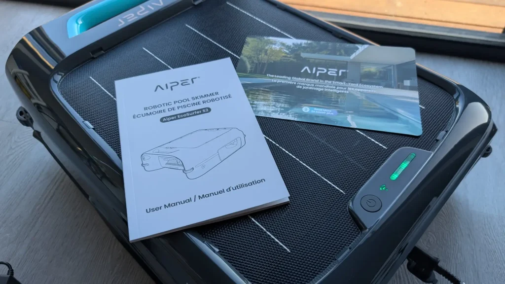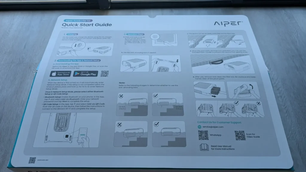 Aiper has done an excellent job with the packaging. The EcoSurfer S2 arrives extremely well protected, with every component cushioned and secured plus the whole experience feels more like unboxing a premium tech product than a pool accessory. Setup is very straightforward thanks to the large, easy to follow poster instructions. It is essentially a matter of unboxing the unit, giving it an initial charge, installing the app, pairing to your phone and then placing it in the pool. There are no complicated steps or fiddly parts to assemble.