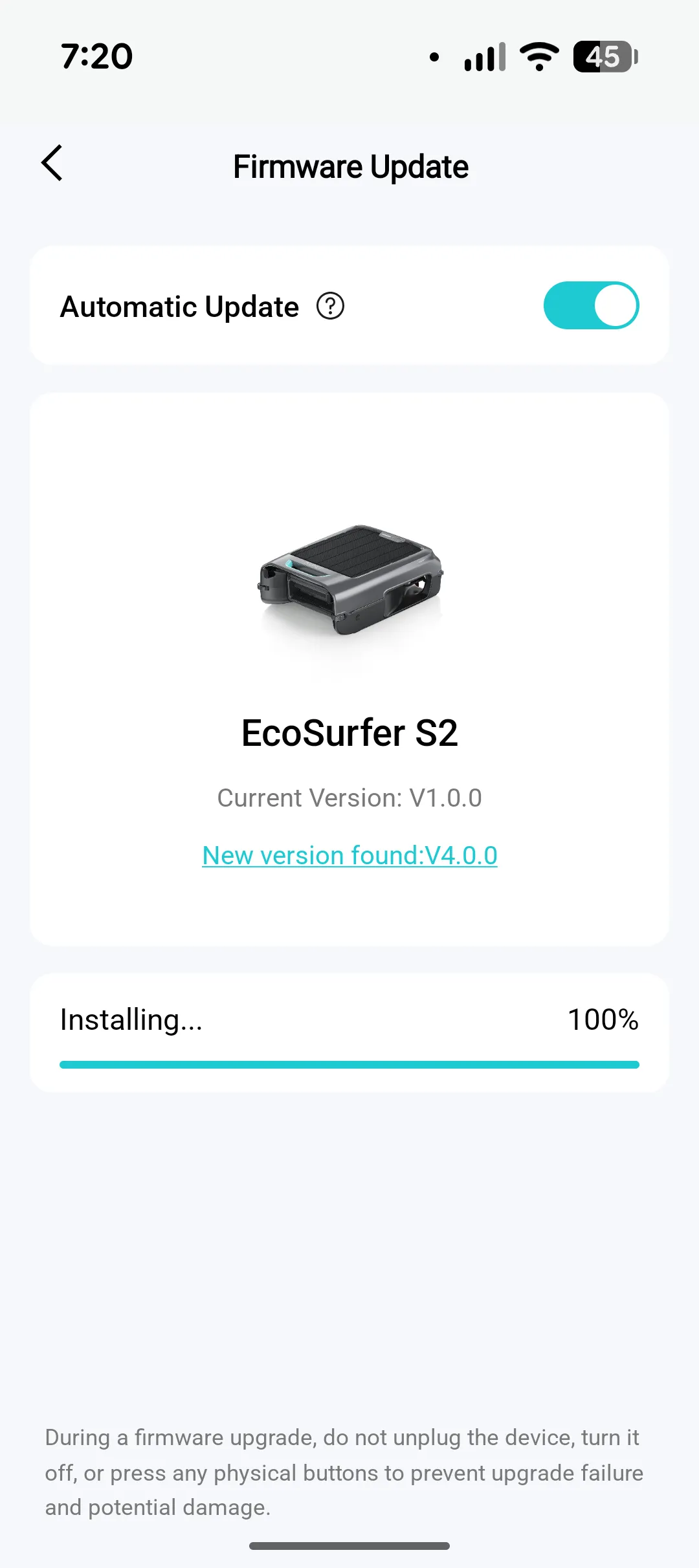 The app also includes a detailed Options section with Clean Path Preferences, Device Information, Network Configuration, Firmware Update, Instructions for Use, Component Management and Log Upload. The presence of a firmware update option means the EcoSurfer S2 can receive improvements and refinements over time, which adds real long‑term value.