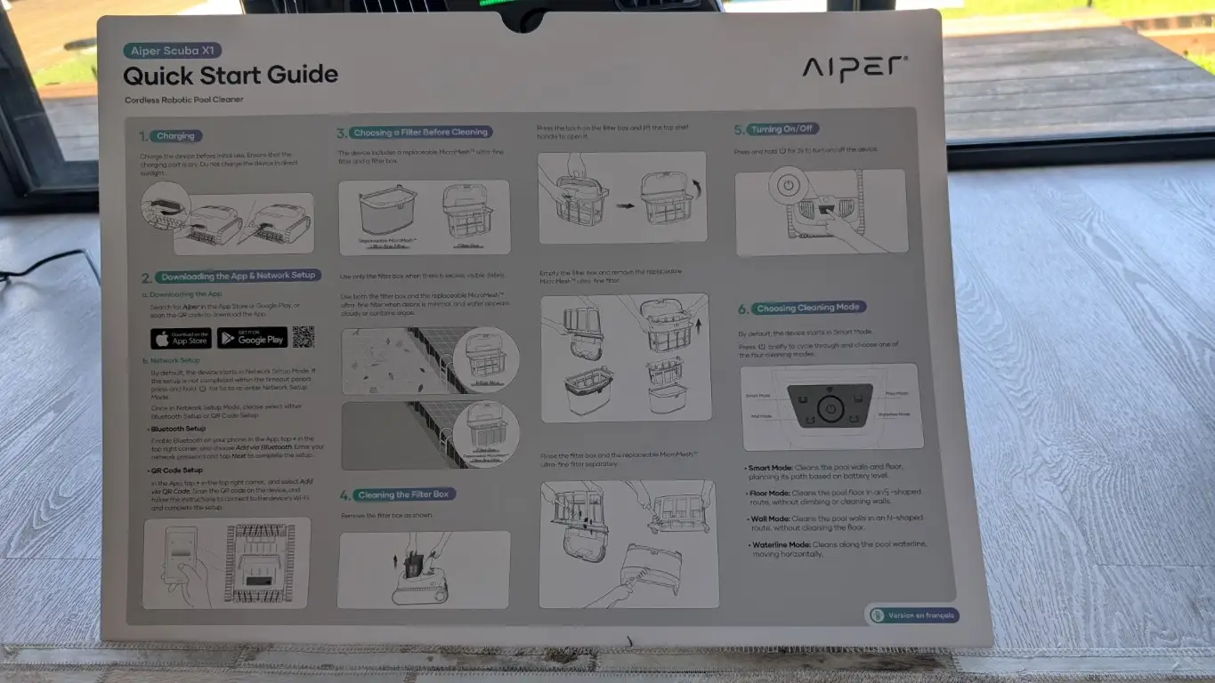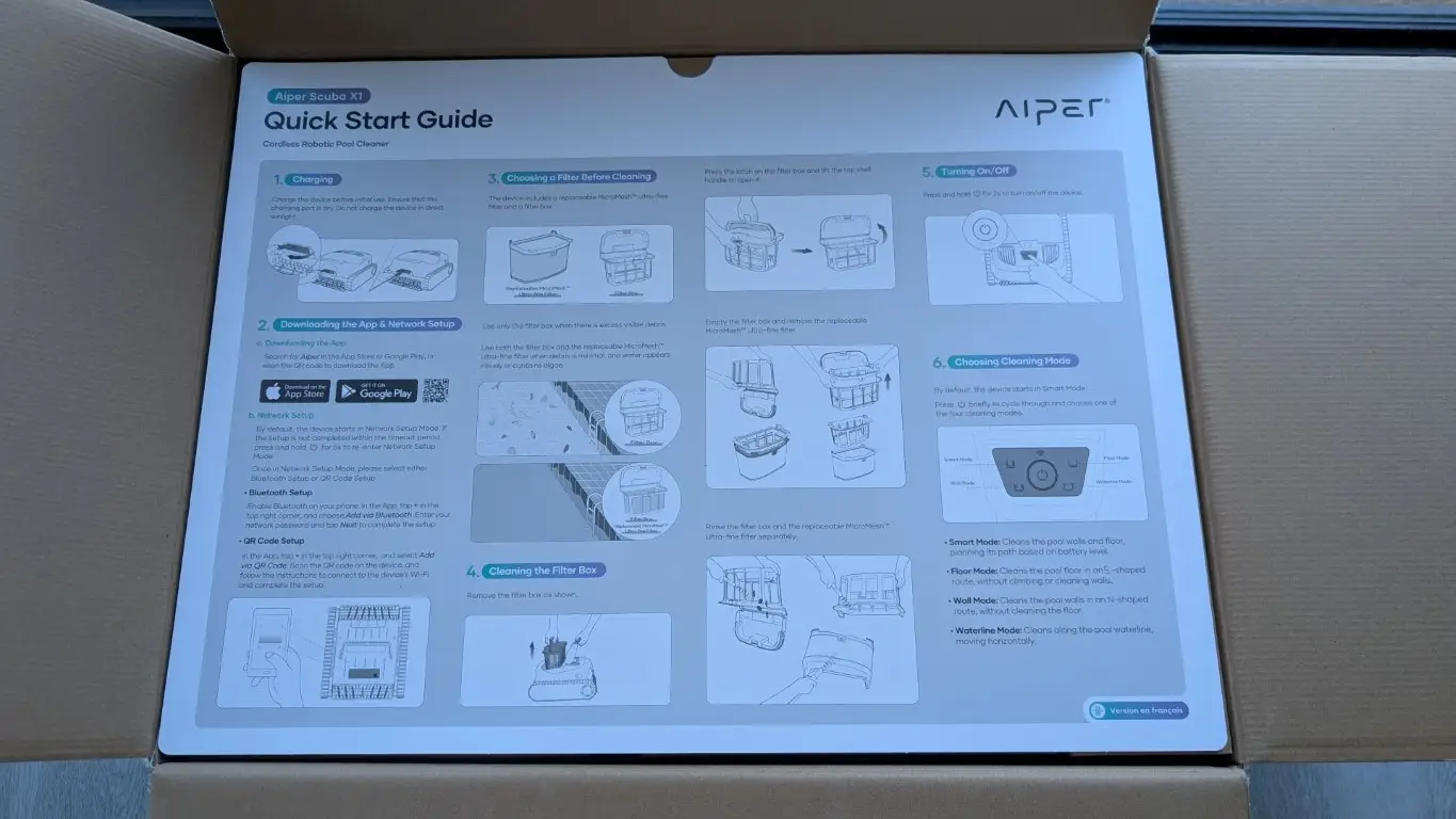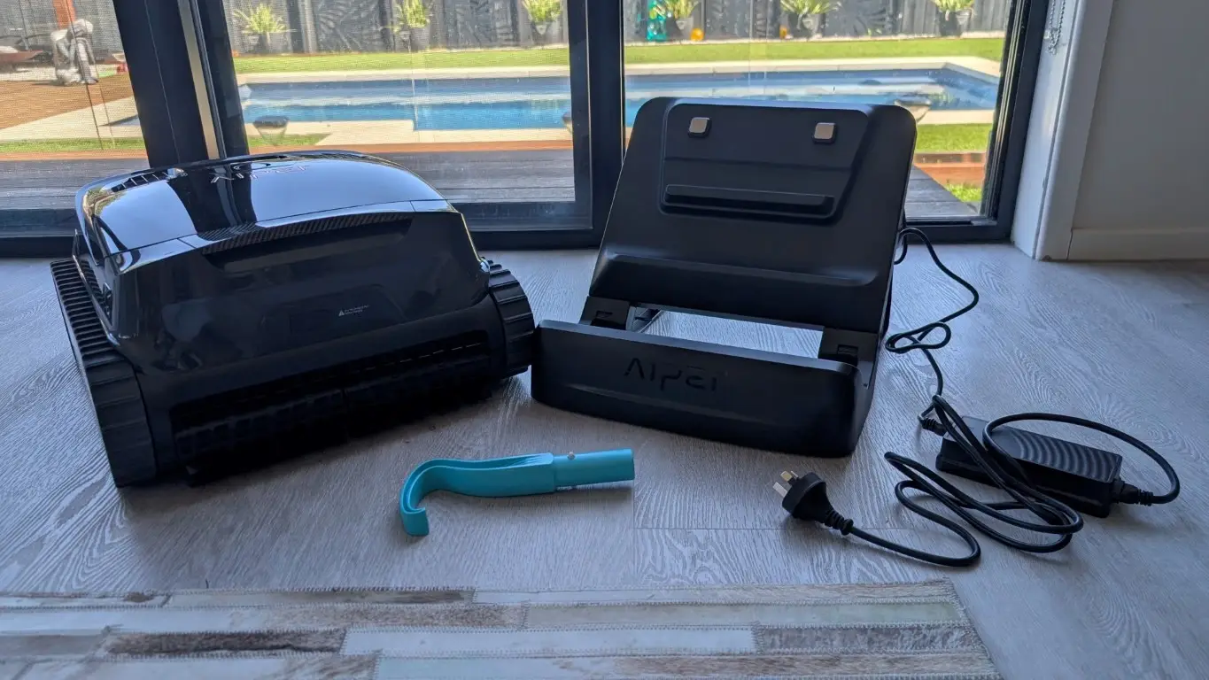Unboxing the Scuba X1 is a bit of a workout as the box is surprisingly heavy, though much of that weight comes from the sturdy, protective packaging. However, you’ll find everything you need inside, the robot, a wireless charging dock, retrieval hook, accessories, manuals and the famous Aiper oversized quick start poster. And its appearance, the all-black design fits perfectly within the high-end market segment, but the true luxury lies in the device’s convenience.