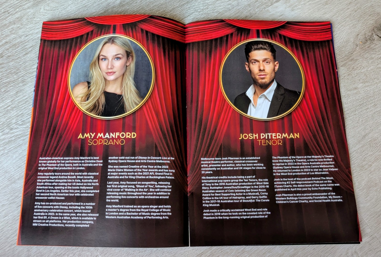 Undeniably, the performance opened with a medley of Broadway showstoppers, a sparkling overture that set the tone for what was to come. From the brassy exuberance of Cabaret to the timeless charm of There’s No Business Like Show Business, the MSO played with both precision and flair, reminding the audience that Broadway’s magic lies as much in its orchestrations as in its lyrics. There was also great on-stage chemistry between the trio, including playful banter and reminiscing. Josh informed the audience that he had just missed out on co-starring with Amy in The Phantom of the Opera, who had just finished her tenure as Christine. However, when all “four” Christines were unwell, Amy returned to the Opera for four weeks to co-star with Josh—saving the show indeed.