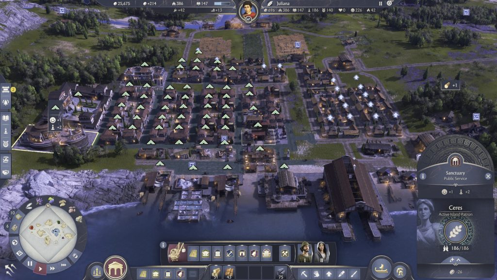 The city-building makes up the meat of Anno 117, but reinforcing its considerable gameplay systems are its systems for religion, diplomacy and research menu. You have a choice of which Roman god to worship for certain bonuses (I picked Ceres because I’m all about the abundance of Garum), a menu to build trade partnerships or negotiate with CPU allies and rivals of varying personalities and playstyles (or bribe them), and a sizeable research tree which allows you to tailor your focus based around Economic, Civic, or Military discoveries. You can unlock entire new buildings, bonus effects for existing ones, and, crucially, new military units, as this game offers combat, too – just don’t expect it to be the main focus.