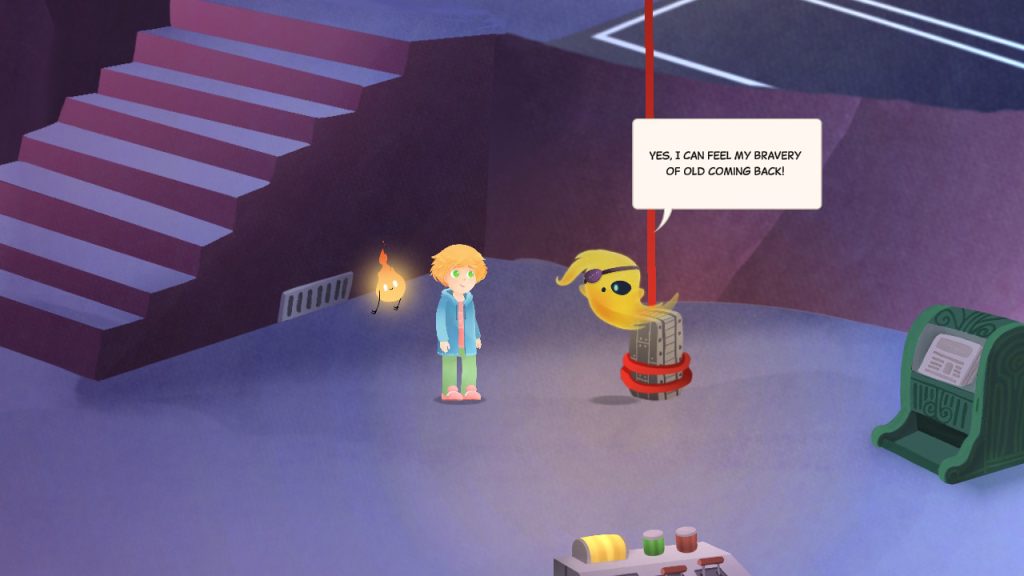 While gameplay moments in The Cranky Volcano sometimes felt thin, Panic at the Mansion expands on them in welcome ways. This time around, players can converse with characters using multiple dialogue options, watch NPCs roam the world without always needing direct interaction, and revisit earlier areas to complete optional tasks such as repairing cute flying robots. These touches make the world feel more alive and interconnected, and puzzle solutions often unfold more organically than before. The new fire companion, Lily, not only drives the story, but also brings light puns and encouragement along the way, which helps keep younger players engaged. Collecting stickers returns as a reward system, with a slicker-looking sticker book that encourages exploration and side quests.