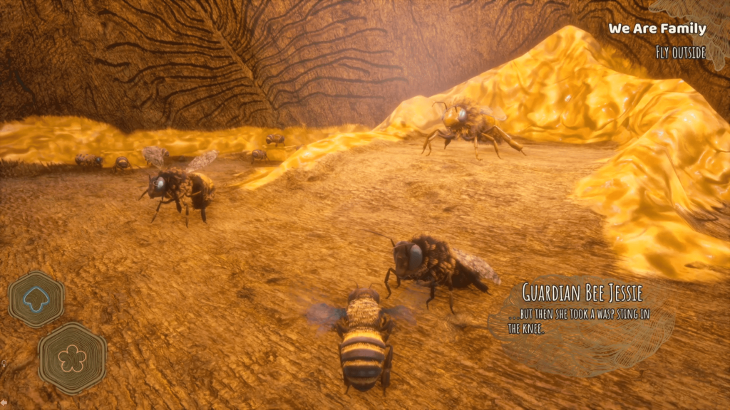 The story remains largely the same as before, centering on a young worker bee who quickly finds herself entwined in the hive’s survival as human activity threatens the colony’s home. It’s a small, earnest narrative that works because it stays grounded in the daily routines and dangers of real bees, presenting their world with a sense of scale and empathy. The tone is warm and gentle, even when danger strikes, and the fully voiced cast, while occasionally uneven, gives the bees and animals just enough personality to pull you into their tiny world. If you played the original, you’ll recognize every beat; newcomers, however, will find a simple but heartfelt tale about nature, teamwork, and environmental awareness.