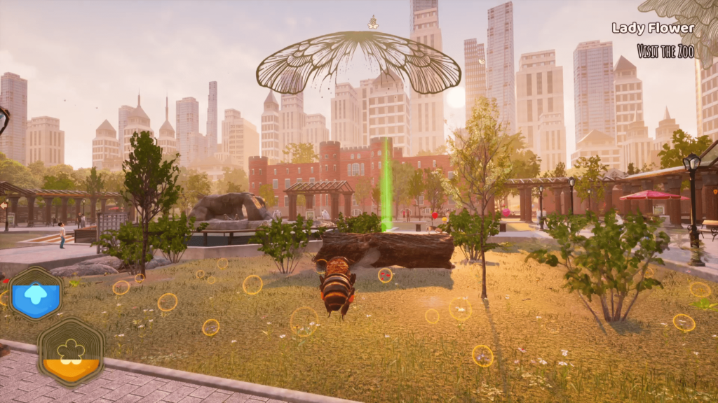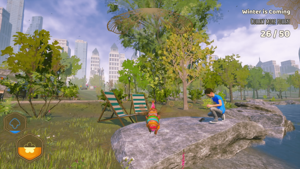 Moment-to-moment gameplay follows the template set in 2019, with accessible flight controls, pollen-gathering loops, and plenty of busywork buzzing around the park. Flying feels slicker on PS5 thanks to smoother framerates and refined responsiveness, and once you get the hang of your bee’s movement, it becomes surprisingly fluid to twist through trees or weave between passing people. The familiar loop of gathering pollen, returning to the hive, and unlocking cosmetic rewards still has that “just one more flower” pull, even if its simplicity occasionally shows through. The map is still the heart of the experience, dotted with animals to meet, secrets to uncover, and plenty of room to glide freely.