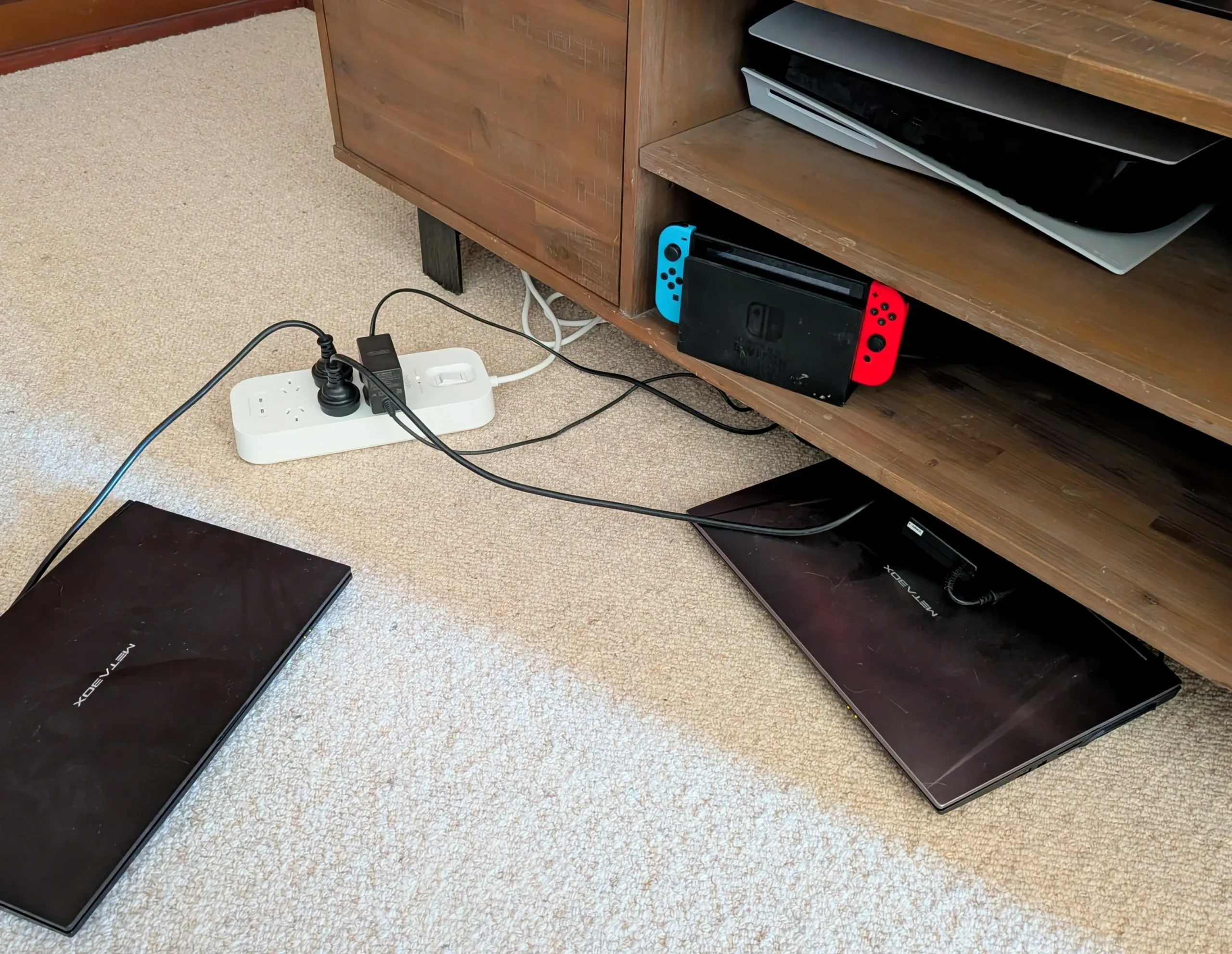 It’s worth noting that the Belkin SurgePro 6-outlet is really really chunky despite its smooth minimalist design. It did not immediately occur to me when I read the dimensions – approx. 26cm long x 10cm wide x 4cm high. But the height really made a difference when it came to fitting it in the narrow space behind or under the furniture, and this is only exacerbated what plug the device your powering uses. The Nintendo switch’s power unit is particularly large for example, and I suspect the Belkin SurgePro is doubling as a load-bearing support for my entertainment unit now that I’ve managed to slide it underneath despite the extra height.