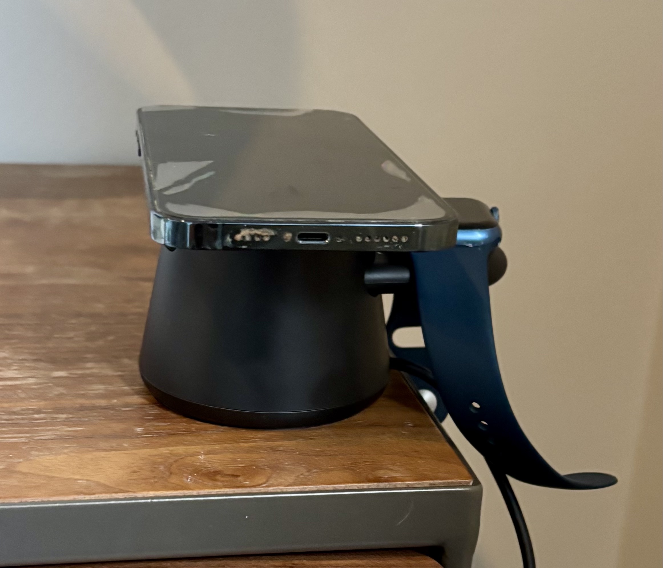 The major component of the dock is the MagSafe smartphone charger. Belkin claims that it offers 5× faster wireless charging. As someone who has struggled with wireless charging in the past, often placing my iPhone on a wireless charging hub for up to an hour only to receive a small boost, I was curious to see if Belkin’s claim that it charges a phone up to 50% in 30 minutes was accurate. I was pleasantly surprised to find that it was true. The dock charges quickly and has no problems with overheating. My iPhone 15 Plus is on the larger side of phones too, and it does not tilt the dock off balance. The dock has now become my go‑to charger when in need of a boost.