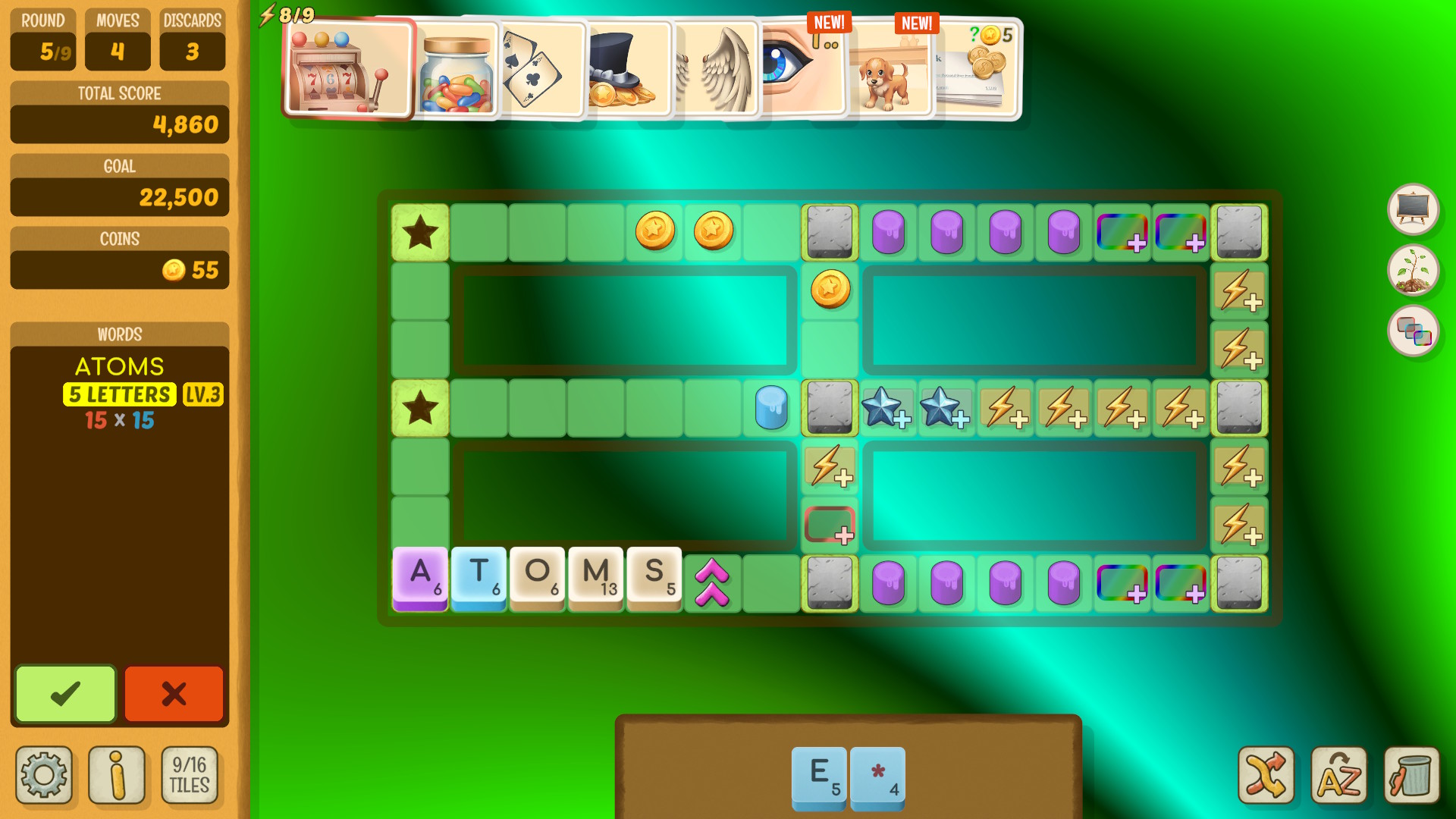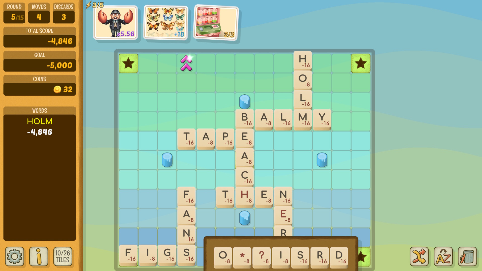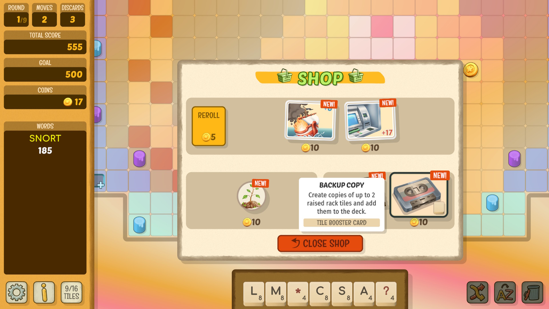 If it’s on special, it’s not bad for a quick pick up and play a round or two… but the random nature of the power cards and boosts and the ludicrously steep starting point for some levels, either via score or play space… means it can get frustrating quickly. I’m pretty near completing it and am quite sure I could with perseverance and more focused strategy… I’ve just lost all interest in doing so. If you like Balatro and think it would be interesting in a Scrabble setting, then I’d say grab a copy!