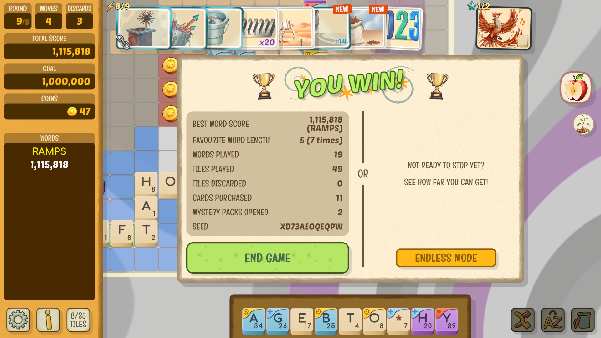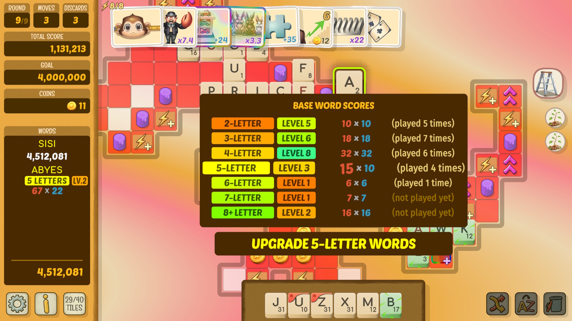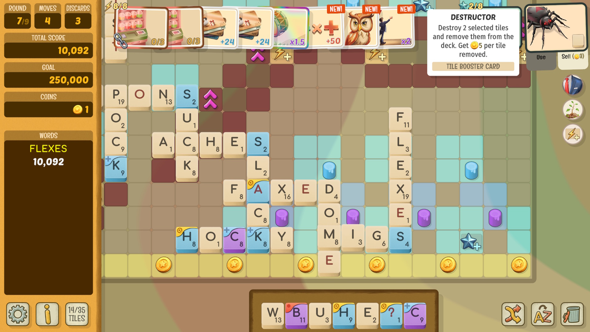 If it’s on special, it’s not bad for a quick pick up and play a round or two… but the random nature of the power cards and boosts and the ludicrously steep starting point for some levels, either via score or play space… means it can get frustrating quickly. I’m pretty near completing it and am quite sure I could with perseverance and more focused strategy… I’ve just lost all interest in doing so. If you like Balatro and think it would be interesting in a Scrabble setting, then I’d say grab a copy!