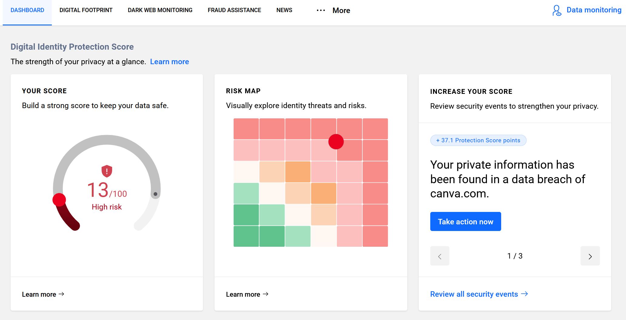 The cost of Bitdefender Digital Identity starts from $5.42AUD per month and although there is no app, it is monitored server side where you have access to a “monitoring” website. The dashboard is simple and easy to understand. Right up front, you get a protection score that shows how safe or exposed your digital identity is. If your score is low, it’s highlighted in red with a clear “High Risk” warning. There’s also a risk map that shows where threats are coming from, making it feel less like a wall of text and more like something you can actually act on.