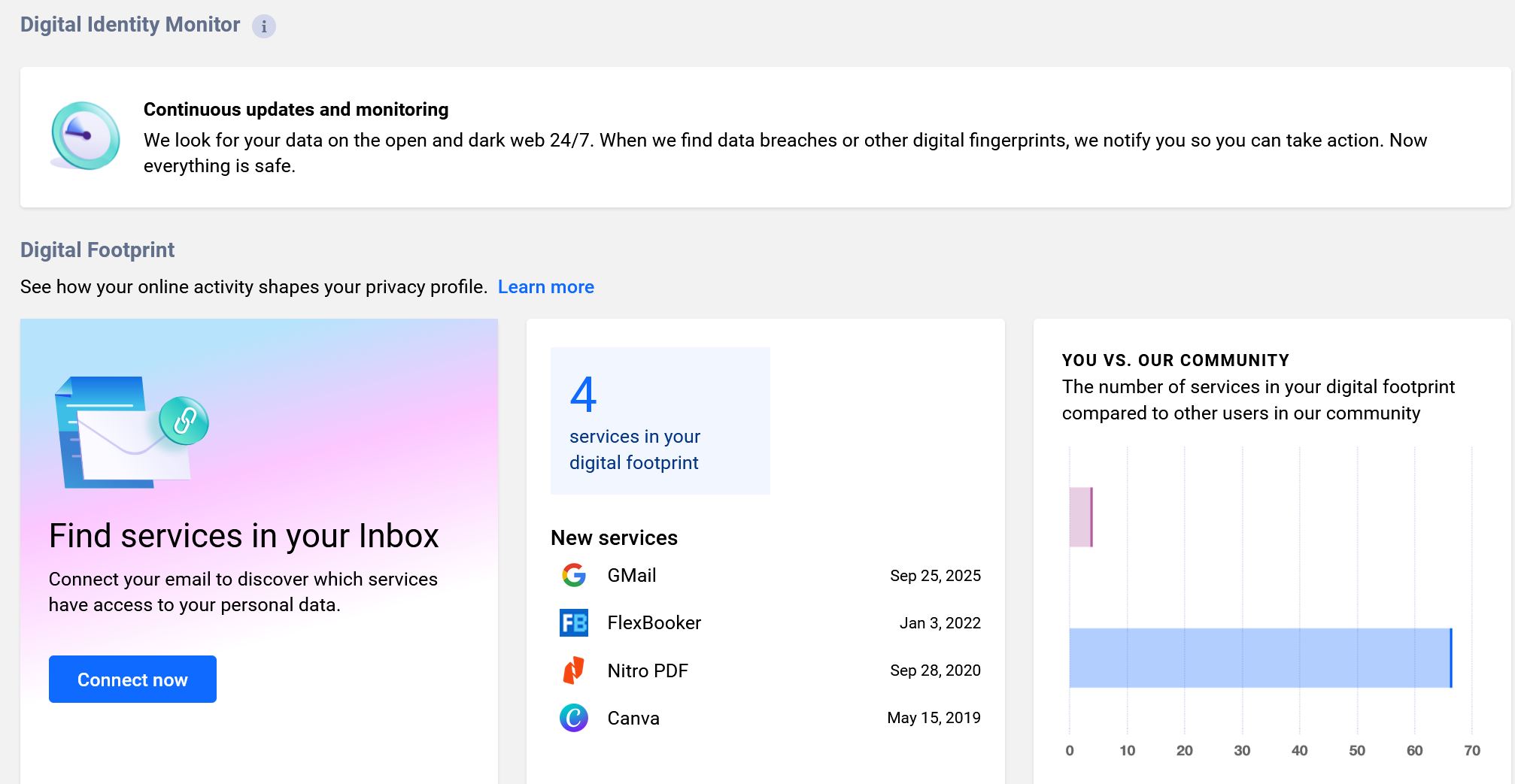 The primary goal of Bitdefender Digital Identity Protection is that it scans both the open web and the dark web for your personal information. If it finds your email, login details or other sensitive data in a breach, it alerts you right away via email. For example, it flagged older breaches from services like Canva and Nitro PDF, complete with advice on what to do next which is changing your password and turning on two‑factor authentication… or delete your account.
