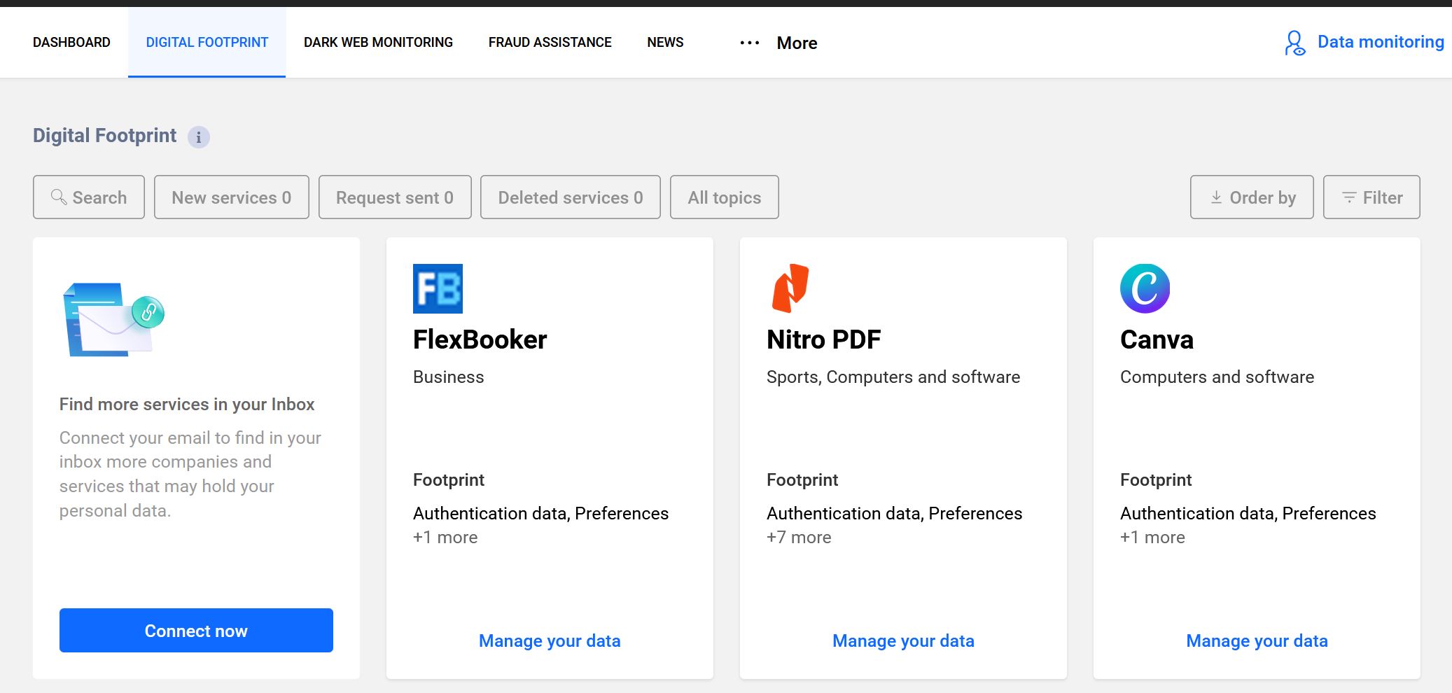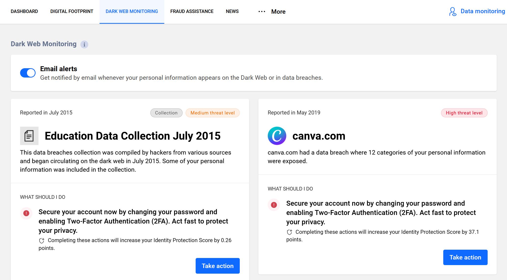 The Digital Footprint section is another eye‑opener as it lists the services that have your data, when they were added, and what type of information they hold. Seeing just how many companies have your details can be confronting, but it’s also empowering because you finally know where your data lives. There’s also a Fraud Assistance hub that explains different types of scams and fraud, from credit card misuse to phishing. Each one comes with a “Take Action” button that walks you through practical steps to protect yourself.