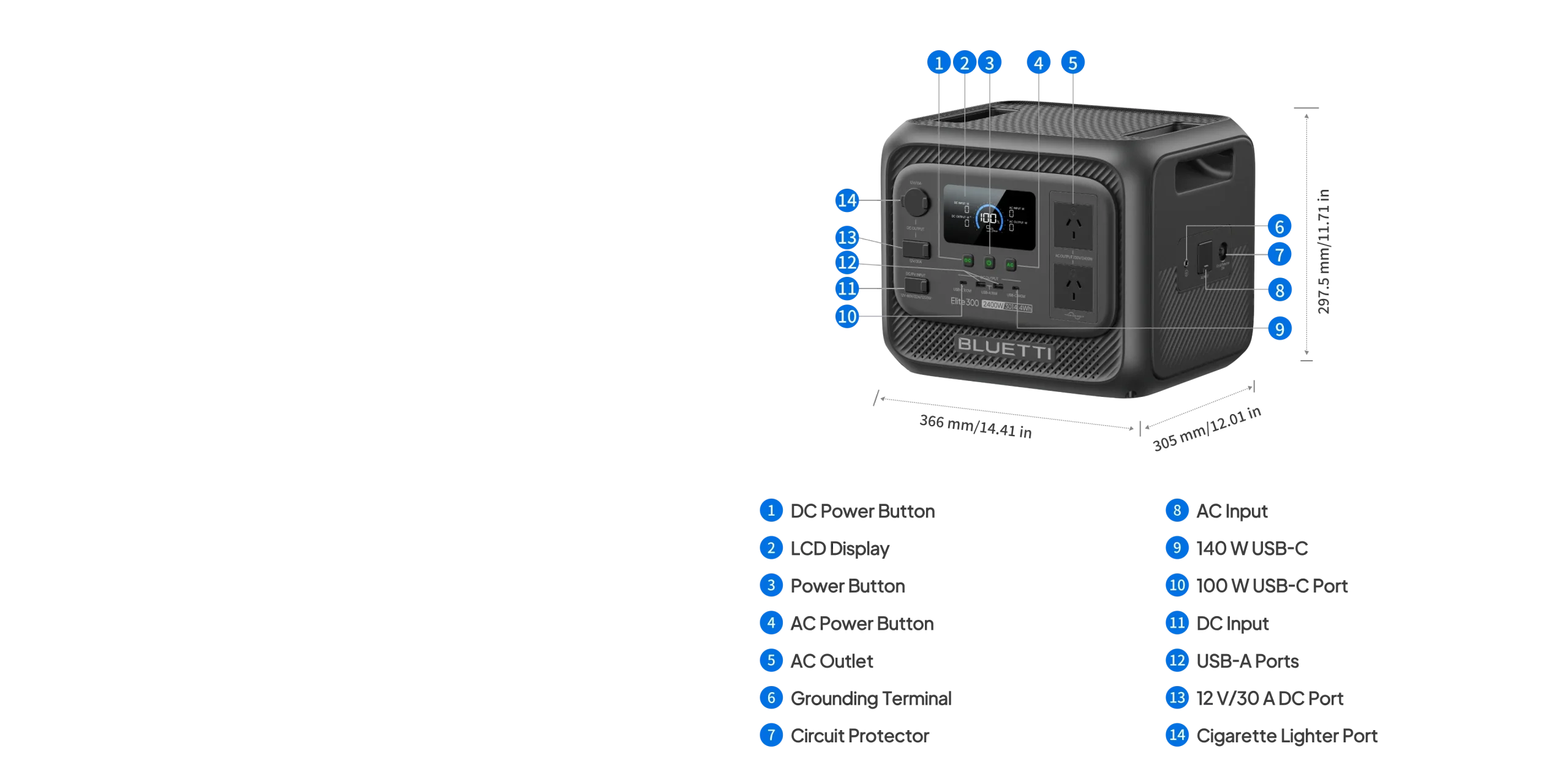 - DC: 1 × 12 V / 30 A high‑power RV-ready DC port (SP2110 connector); 1 × 12 V cigarette lighter port