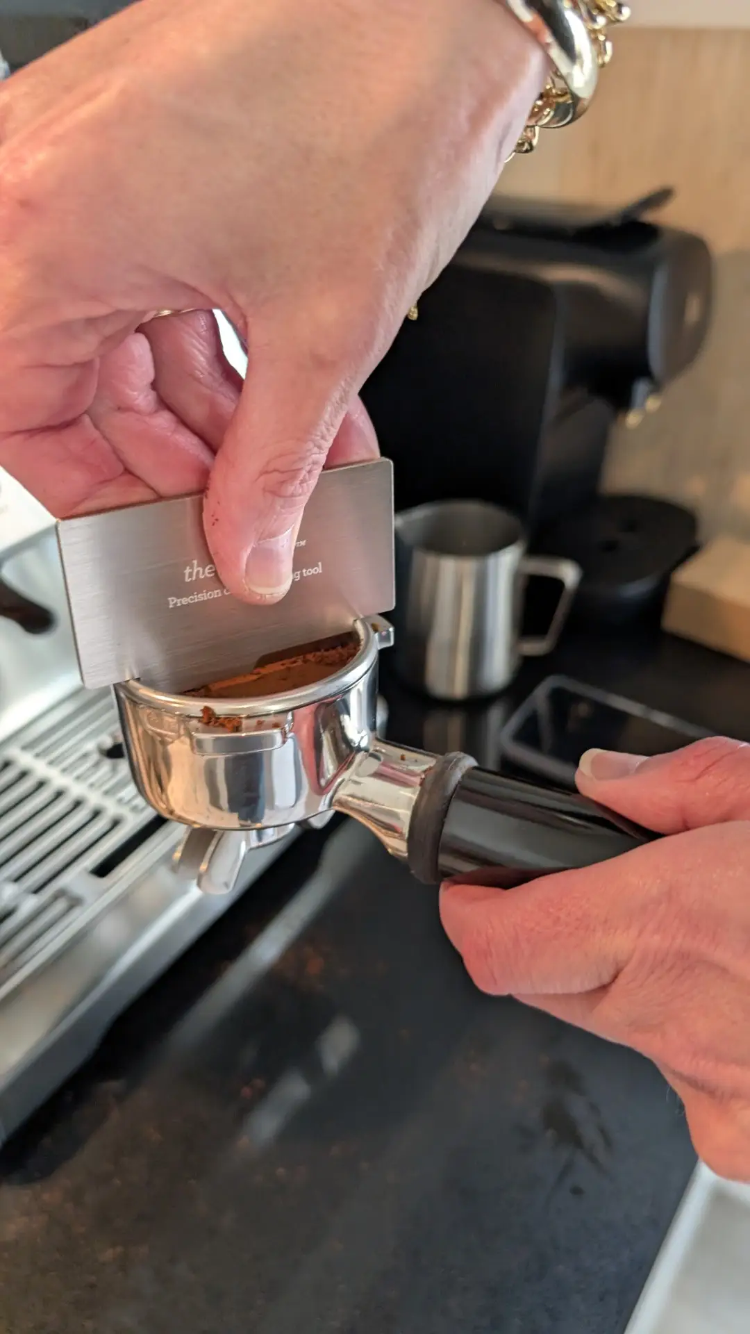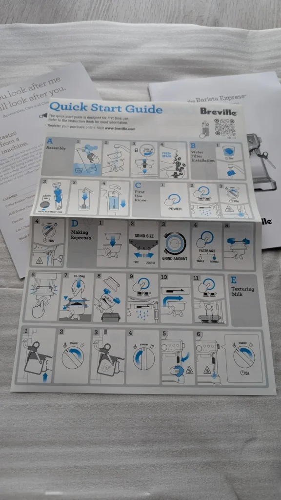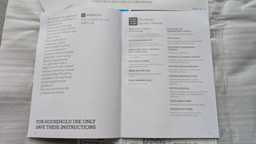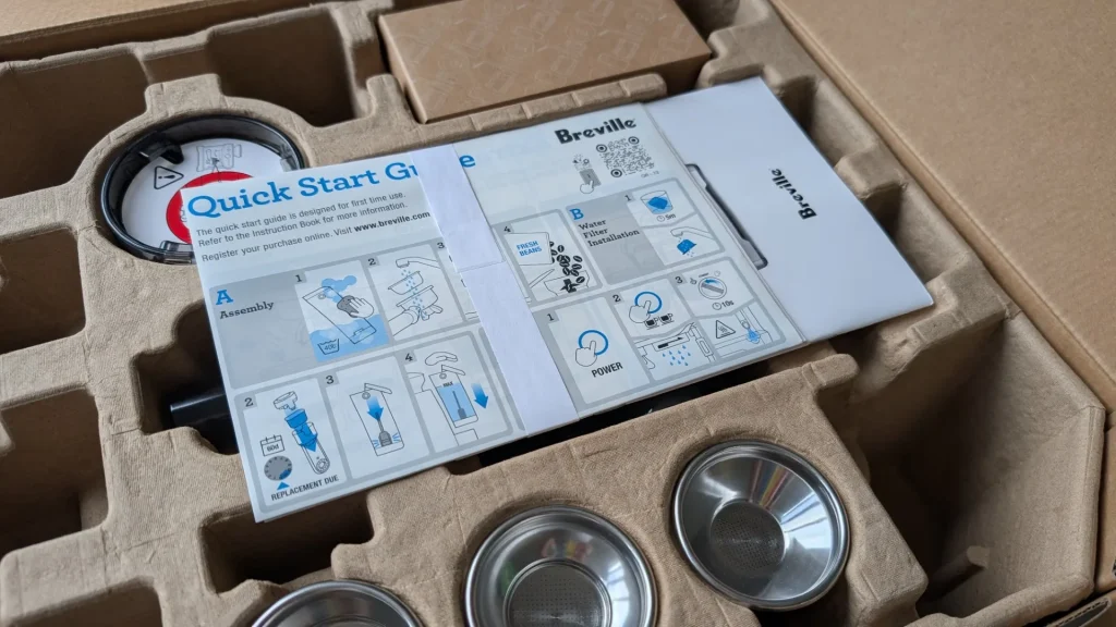 To use the Breville BES870 Barista Express, you need to wash the accessories, soak the filter for 5-minutes, wash and then place it into the water tank before filling it up. You then start by grinding fresh beans directly into the portafilter with the built‑in conical burr grinder, adjusting the grind size and dose to suit your taste. After tamping the grounds evenly, lock the portafilter into the group head and pull a single or double shot, keeping an eye on the pressure gauge for optimal extraction. If you’re making milk‑based drinks, you then use the steam wand to texture milk to your preferred level of creaminess before pouring it into your espresso for a café‑style result.