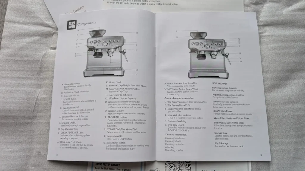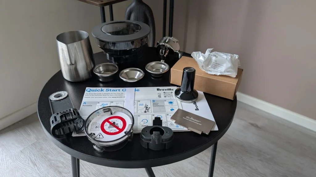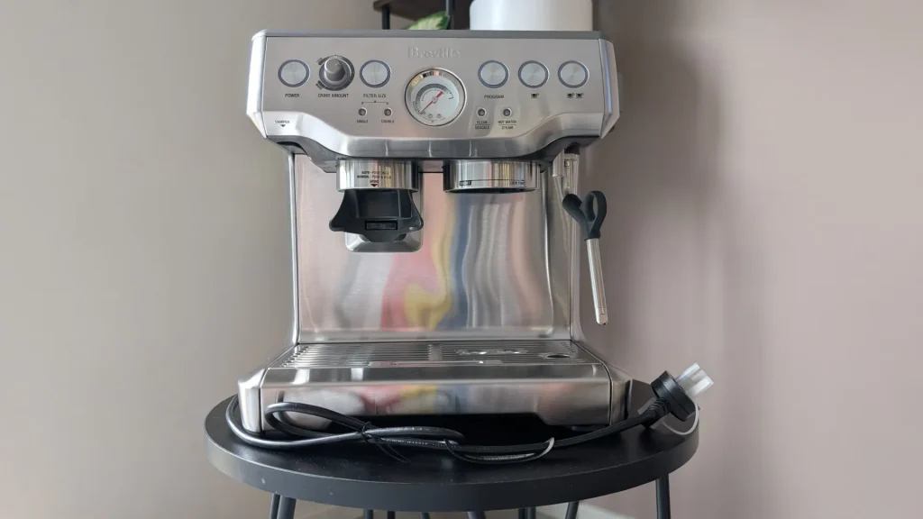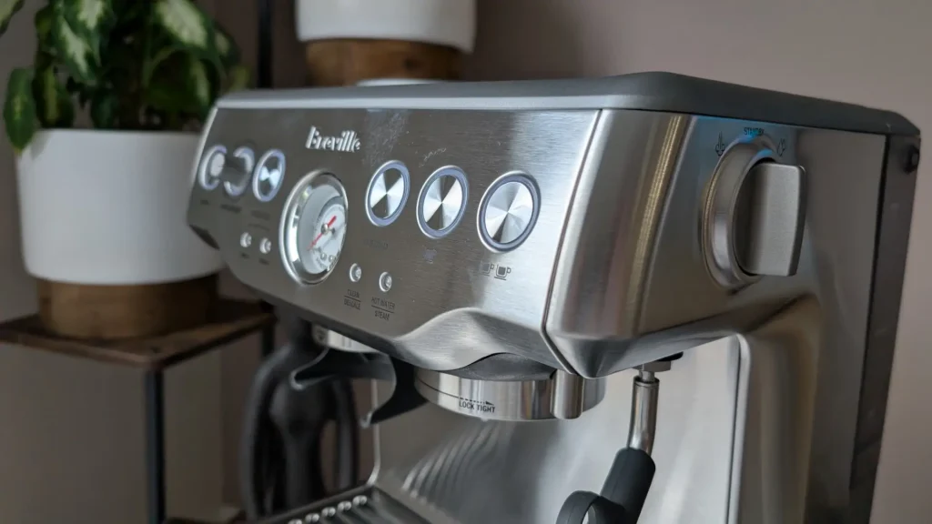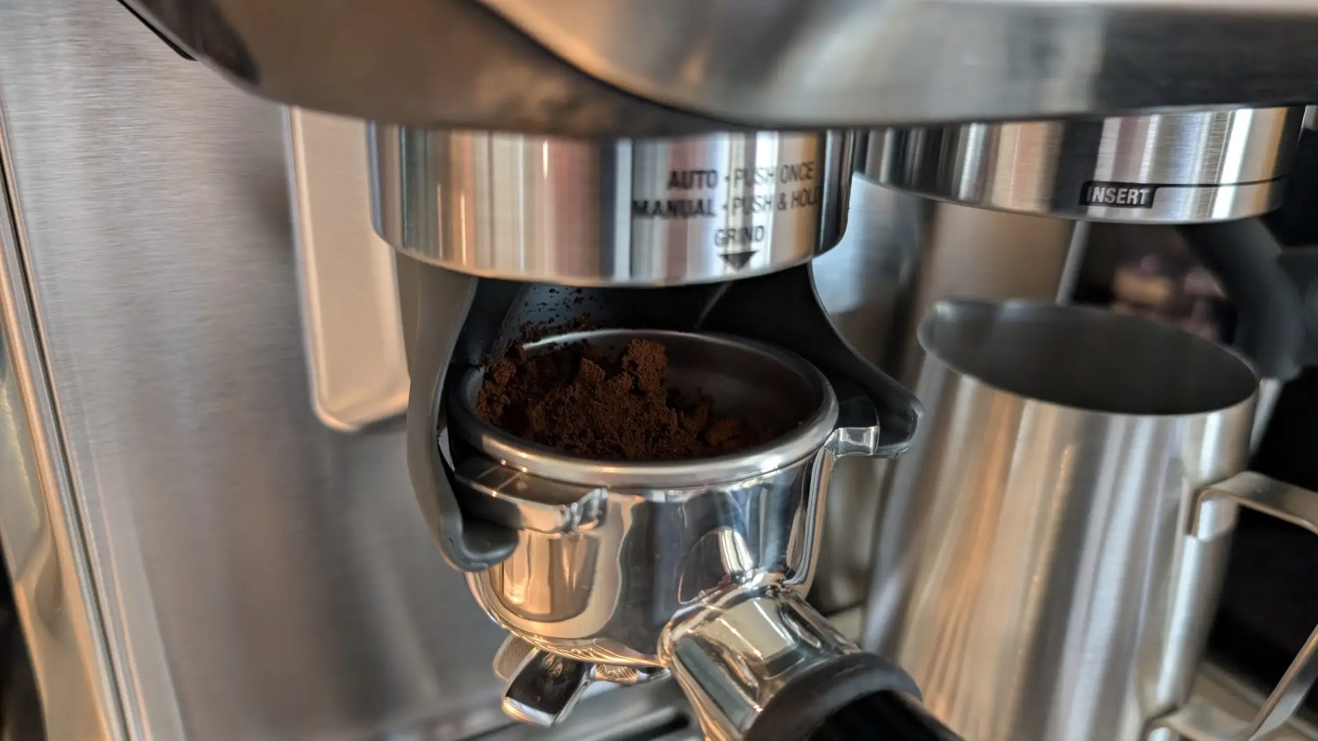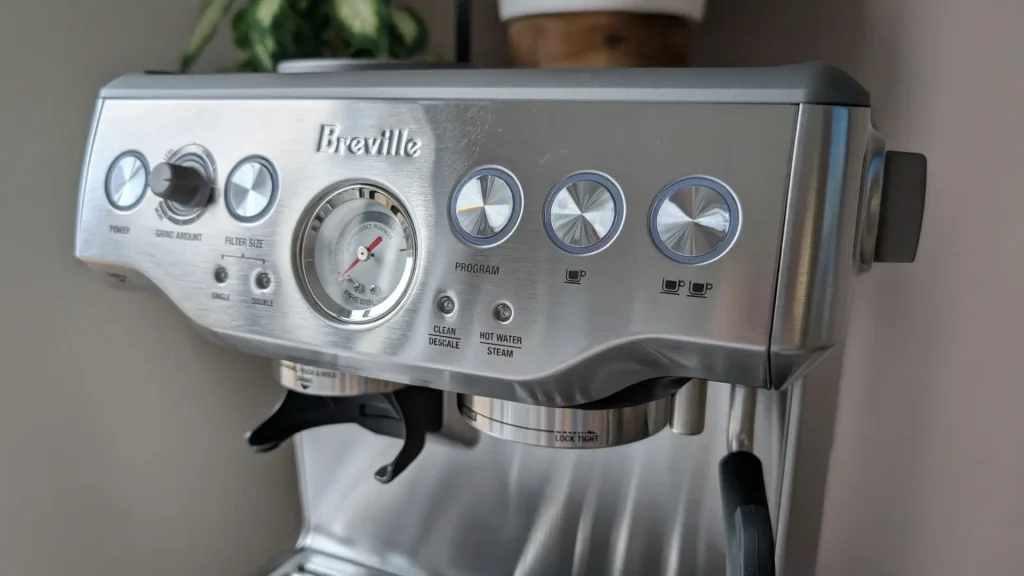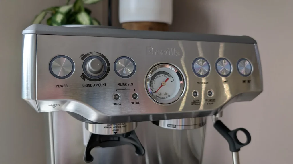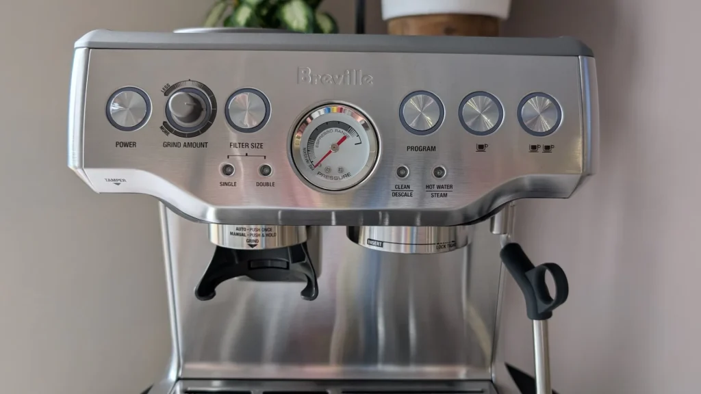 The built-in grinder is the BES870’s standout feature. With 16 primary grind settings (and more available via the top burr), it removes the need for a separate grinder and makes dialing in espresso more approachable. The machine includes both single- and dual-wall (pressurized and non-pressurized) portafilter baskets, supporting users from complete beginners to those aiming for café-quality shots.