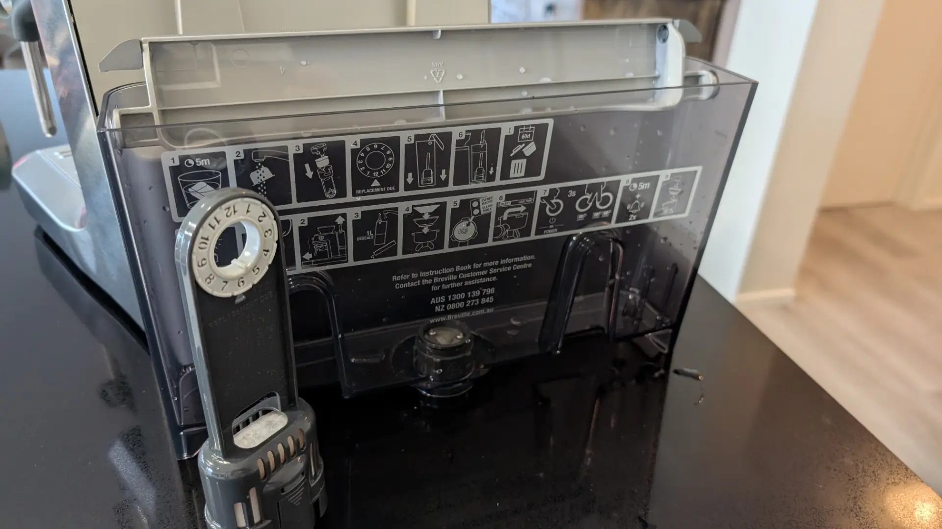 Once unboxed, the Breville BES870 Barista Express feels solid and durable, yet its footprint (Height 407mm x Depth 313mm x Width 338mm with a weight of 12.5kg) is small enough for kitchens where space is at a premium. Inside, it runs on a 15-bar Italian pump and a Thermocoil heating system, which delivers quick heat-up times and relatively stable water temperature. Breville also includes a low-pressure pre-infusion phase, gently wetting the coffee puck before full extraction to enhance flavor balance and crema. The removable 67-ounce (1.98 litre) water tank is generous for a machine of this size.