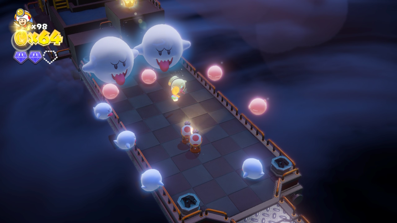 Boo Spotting is the other newly introduced game mode and is the weaker of the two modes, in my opinion. Boo Spotting levels play much like a regular Captain Toad level, however in certain sections a group of Boos will ambush the players and must be defeated in order for the Toads to safely move on. Boos are thwarted by shining the flashlight on Toad’s head directly at them. Two flashlights aimed in unison will defeat the Boos far quicker than a single beam, so strong coordination is required when playing with a partner. When playing solo, Double Cherries are provided around the level to ensure that you aren’t at a disadvantage.