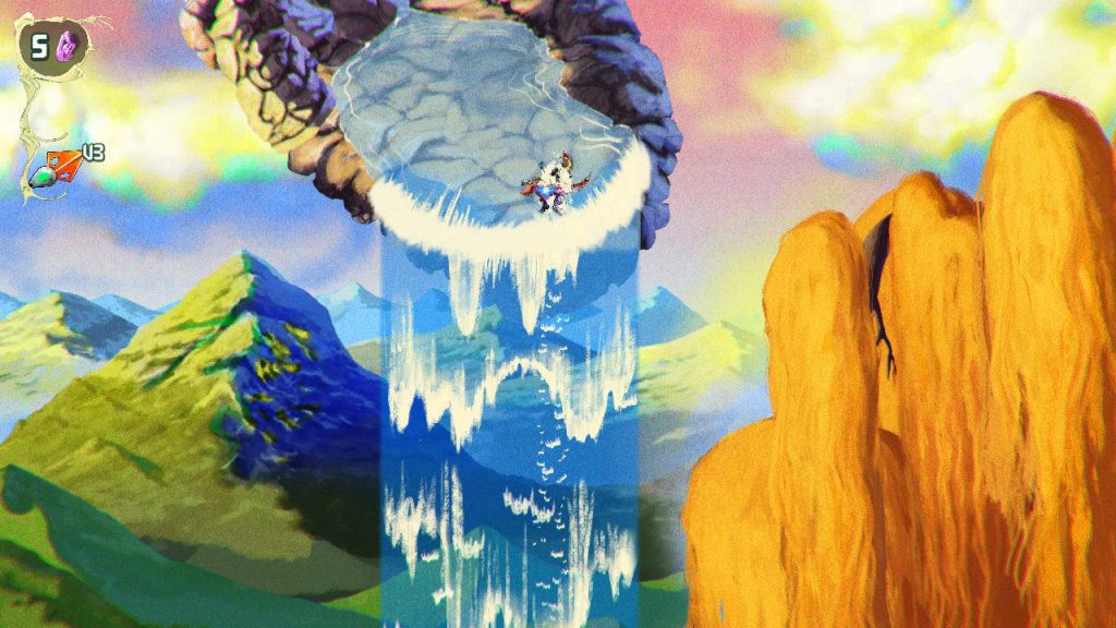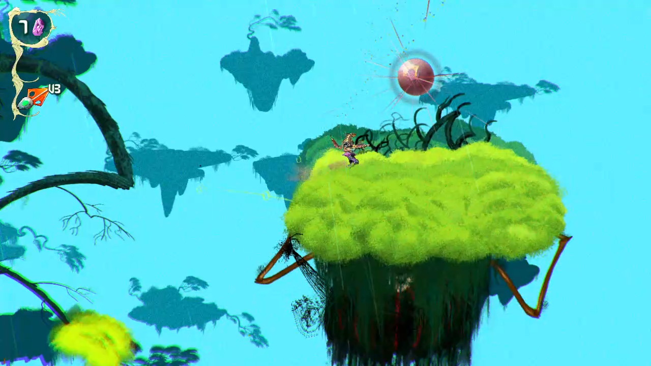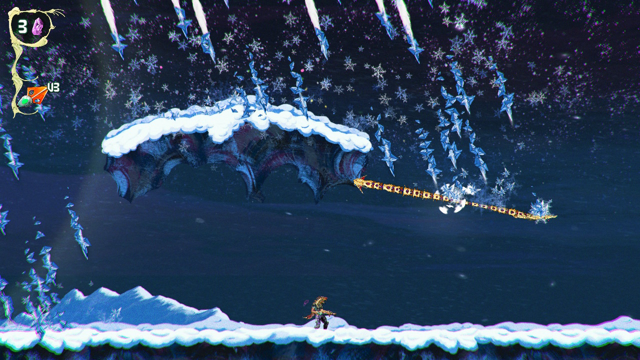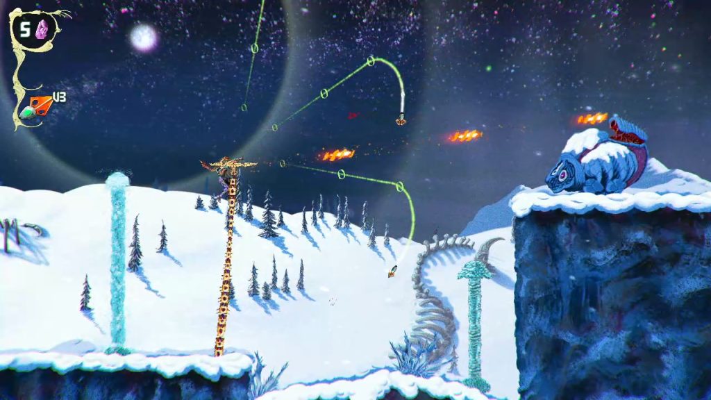 Levels are large, side scrolling spaces with a strong sense of verticality, and while it isn’t a full Metroidvania, it borrows just enough from that structure to keep exploration meaningful. You’re collecting Star Spores to progress through a set of branching stages, with optional routes leading to upgrades, minibosses, and secrets. Movement and combat are tightly connected, and both revolve around mastering the ChainStaff. You can throw it in an arc or launch it straight ahead, plant it into surfaces to create platforms, swing across gaps, block incoming attacks, and even reposition it mid use to create bridges or gain better angles in combat. It’s less of a weapon and more of an extension of your body, and once it clicks, the game opens up in a big way.