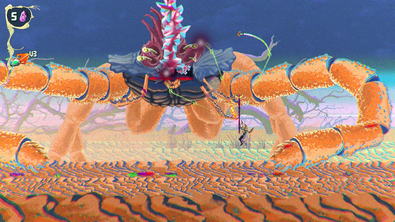 Visually, ChainStaff stands out in a big way. The art direction pulls heavily from 70s and 80s album cover aesthetics, and it shows in every environment and enemy design. You’ll move through icy caverns and swamp-like areas, but they’re layered with surreal details that make them feel completely alien. Creatures are grotesque and imaginative, ranging from armored beetle like enemies to floating monstrosities that barely resemble anything familiar. Bosses push that even further with designs that are equal parts unsettling and impressive. The game doesn’t hold back on gore either, and while it can get intense, it fits the tone. Cutscenes use a motion comic style that feels simple but works well with the overall presentation.