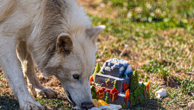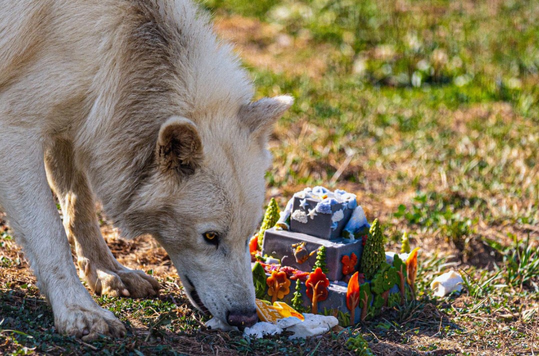 Colossal partnered with Mishka, a luxury dog bakery in San Francisco, to create a three-tier, wild-themed cake crafted by founder and head chef Olia Rosenblatt. Her team spent 15 hours designing a custom 3D wolf mold and assembling the cake, made from beef pâté, broth, liver,