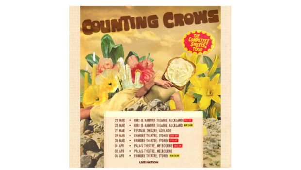 Counting Crows will commence The Complete Sweets! Tour in Auckland at Kiri Te Kanawa Theatre on Monday 23 and Tuesday 24 March, before heading to Australia for a show at Festival Theatre, Adelaide on Friday 27 March, followed by Sydney’s Enmore Theatre on Sunday 29 and Monday 30 March, then heading to Melbourne for shows at Palais Theatre on Wednesday 1 and Thursday 2 April, wrapping up in Sydney on Monday 6 April at Enmore Theatre.