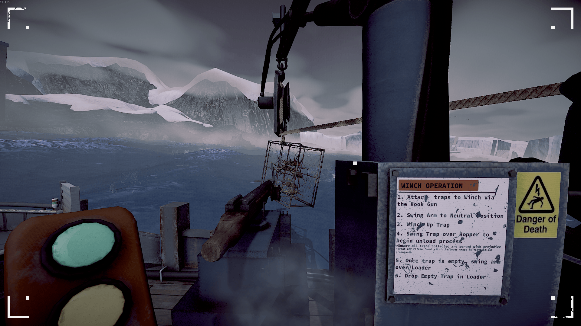 As previously mentioned, you’ll be driving around a LOT. The game runs on an in-game timer that is displayed around the ship, meaning there is a reason not to waste too much time fulfilling your quota. Much of the action consists of you releasing traps into crab spots, maintaining your ship, and protecting it from any bad things looking to make your life worse. Since I went into this game with different expectations, the reason I did not like it initially was because it felt so slow. Even on the highest throttle, your ship can feel like it’s slugging through mud rather than water. That was before I found a plethora of side objectives and oddities for me to explore on the map. There are the easy ones: extra traps and lore bits, but you can really explore anywhere on the map that the game allows you to. And that provides the game with a lot of opportunity—opportunity it takes and runs with.