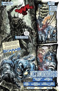 The next chapter of DC’s Year Of The Villain arc has arrived, and with it comes, Scarab(A.K.A. Blue Beetle). But this tale is a dark tale for Jaime Reyes. After being stabbed in the neck by The Batman Who Laughs, Jaime loses control of his powers and the full power of the scarab is unleashed. Jaime than transforms into a villainous bug! Immediately following this transformation, two things happen, first he eats Ghostfire, and second he realizes he’s still himself but cant stop. And all the while The Batman Who Laughs is in his head, laughing, and taunting.