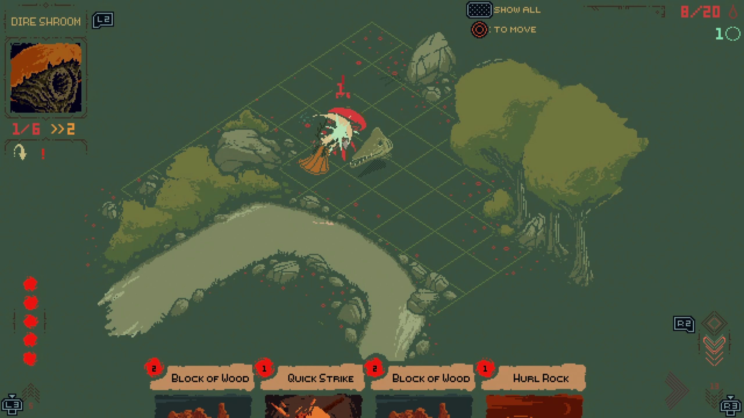 Encounters take place on a grid. When you walk into a cluster of enemies, you are pulled into a tactical battle where positioning matters as much as the cards in your hand. You and your enemies take turns moving and acting. Some spirits attack from range. Frogs leap over allies to get into better positions. Snails poison you and hide in their shells. Dragonflies lay larvae that can overwhelm the board. Certain enemies move again after striking you. Others drag you closer before attacking. Fights can look hopeless at first glance, but you have more tools than you think.