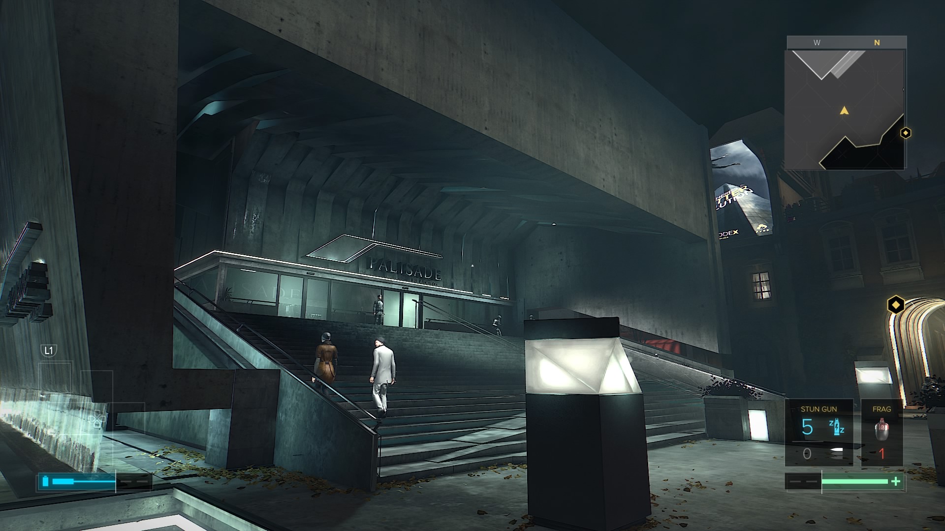 In System Rift, perhaps more than ever, the option of a lethal approach seems like a pointless inclusion. The joy comes from sneaking through vents, from avoiding patrols, from hacking computers and doors, from hiding unconscious bodies under staircases. Open combat, by comparison, is bland and unsatisfying. Stealth affords other benefits: the ability to eavesdrop on guards and Palisade employees, all of whom have fun dialogue. My most memorable moment: listening to a guard complain about the bank’s lack of danger, moments before I leap over a staircase, stun gun his partner, and then knock him out. Priceless.