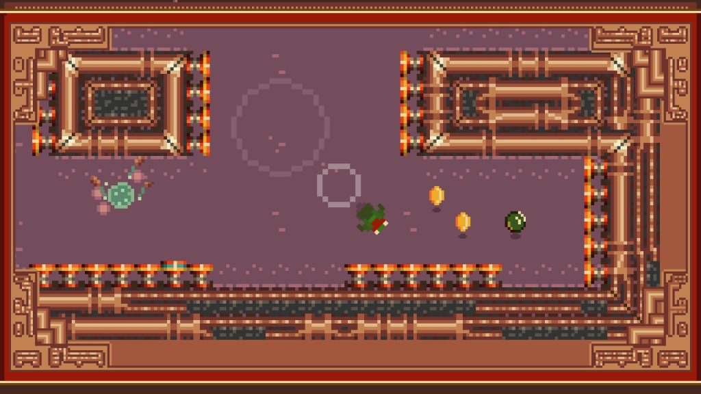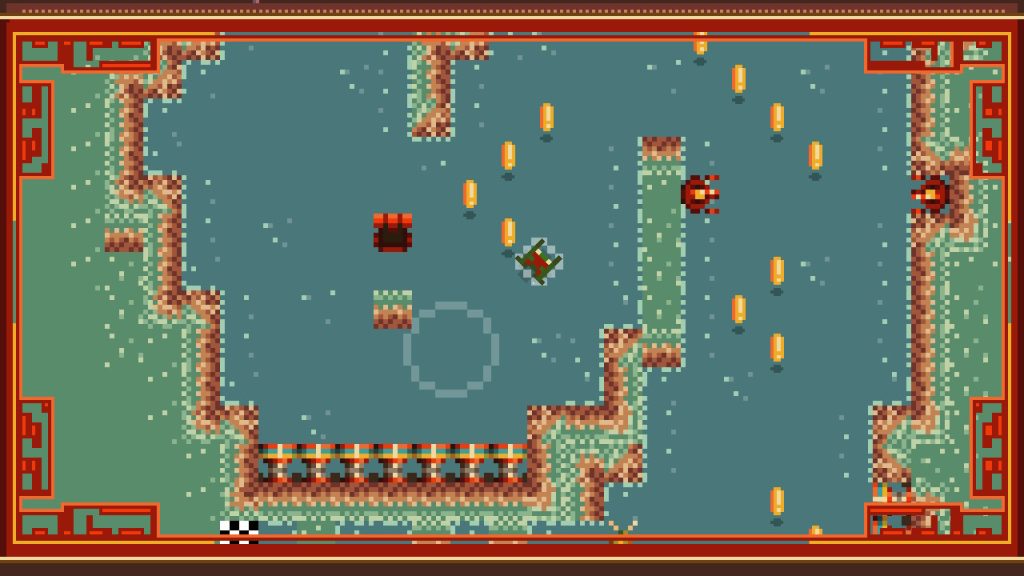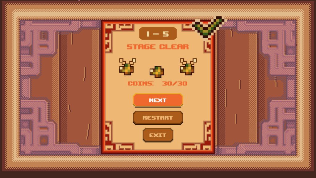 Visually, Direction Quad succeeds by keeping things clean and readable. The chunky pixel art embraces a retro aesthetic without sacrificing clarity. Environmental details like the ripples trailing behind Quad as he hops, the sparkle of collected coins, and the subtle variations in color palettes between stages all add visual interest without cluttering the screen. Purple waters, red walls, dark blue swamps, and forest-green backdrops help distinguish areas while maintaining a cohesive style. The simplicity works in the game’s favor, ensuring that hazards and paths are always easy to read, even when levels become dense.