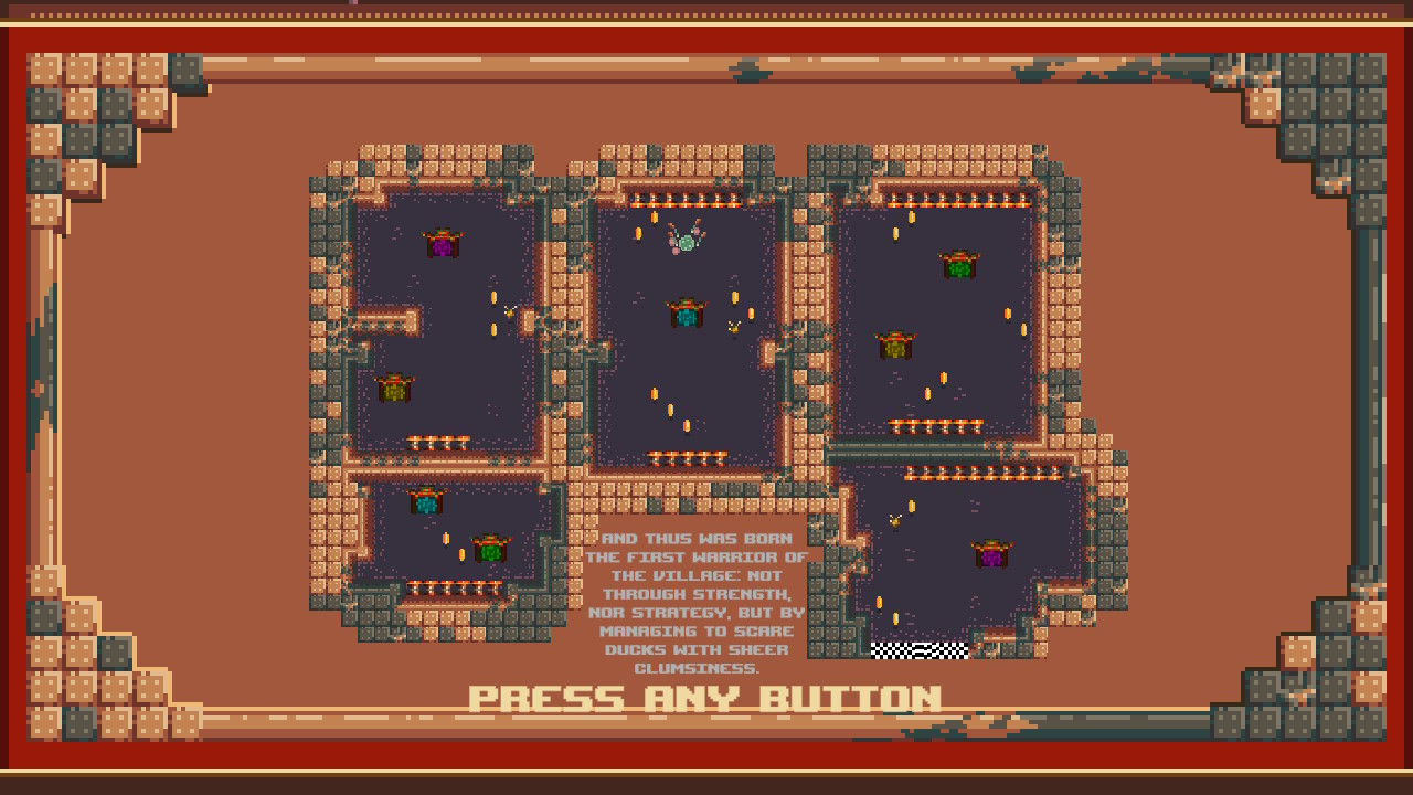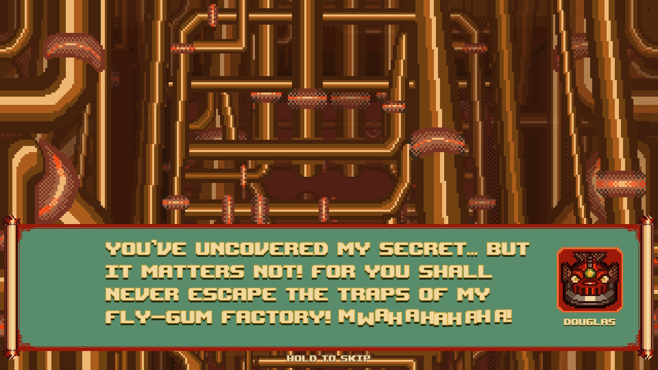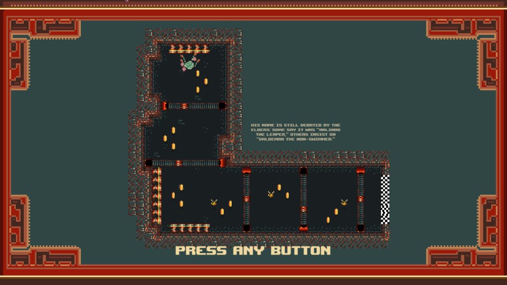 You play as Quad, a frog who has just completed years of grueling training under the Wise Toad. As the so-called “Chosen One,” Quad is tasked with completing the Ten Terrible Trials to earn the title of Warrior Toad. Quad, however, is far less enthusiastic about destiny than his mentor, frequently complaining about the inconvenience of heroics, the dangers ahead, and the lack of something as basic as a lunch break to eat his sandwich. The narrative unfolds through text-only sequences between levels, with occasional flavor text appearing before stages to frame the next challenge. The tone is whimsical and knowingly cheesy, which works well enough for what it is, but the presentation does limit its impact. Given how strong the pixel art is elsewhere, the absence of character portraits or expressive artwork during dialogue feels like a missed opportunity to give the cast more personality. Ultimately, though, the story is clearly secondary, existing to provide context rather than emotional weight.