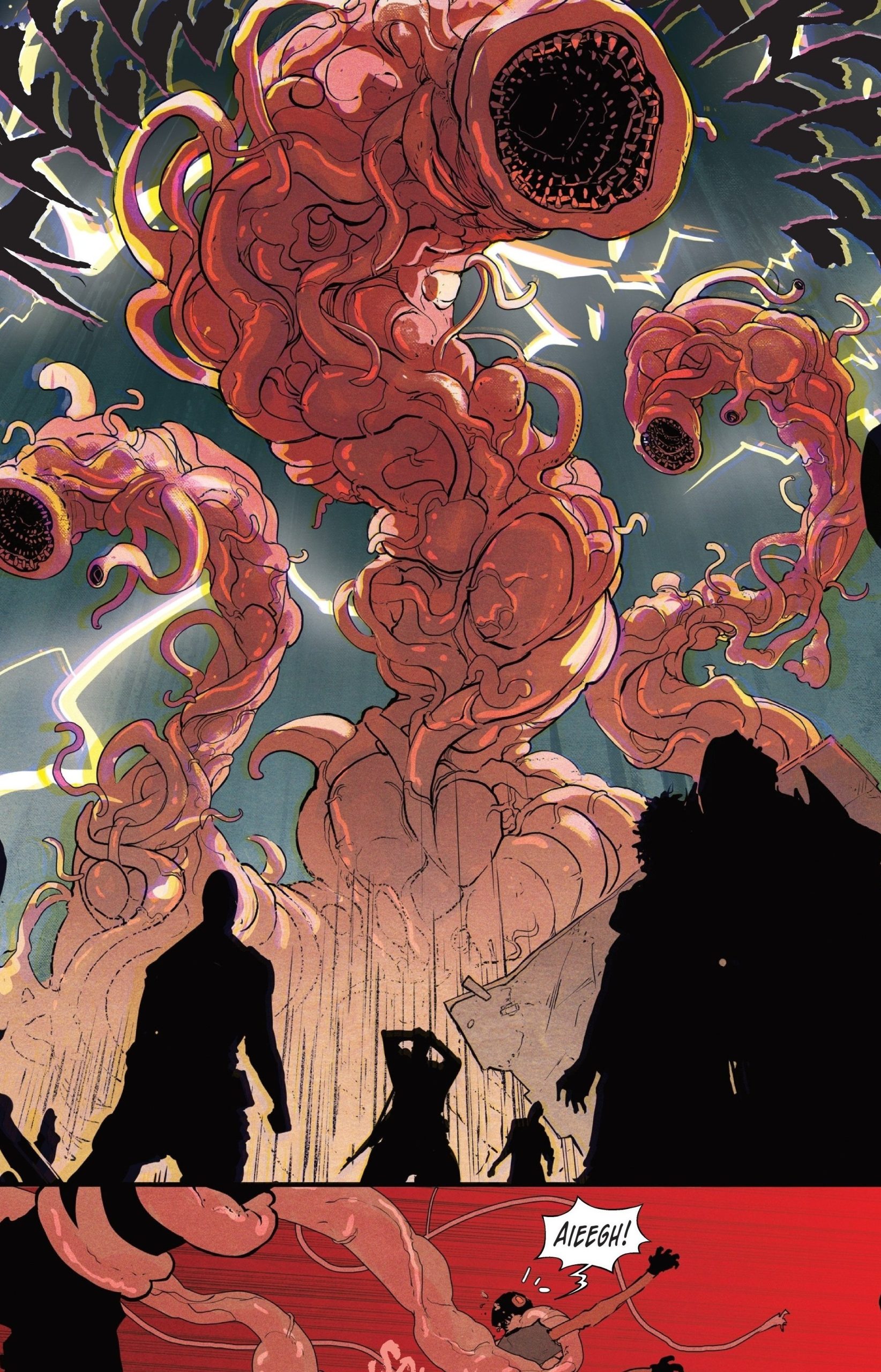 Returning to a unique tale of kaiju mayhem, Tim Seeley (Bloodshot, Chew) delves more into who Jacen is as a character and how he fits into the frame of his grudge against Godzilla itself. Godzilla #2 is packed with many surprises into one comic book. To avoid spoilers, Godzilla has shaped the mindset of humans and how they perceive coexistence with Kaiju. It’s either accepting them for what they are or vowing to eradicate them by any means necessary. As in the Commander’s case, he’s willing to do so even if it means using a new uncontrolled discovery to achieve that mission. As the pacing of the story feels natural, there is a sense of mystery whenever Lament appears. Surely, Seeley will explain this later, but this additional inclusion of a villain makes this story even more chaotic. Whereas Godzilla and the other Kaiju weren’t already a problem, a Kaiju that can devise a strategic plan and carry it out is even more entertaining.