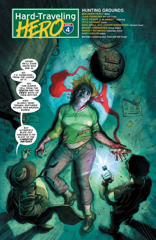 Hard Traveling Hero part 4 gets dark as the issue opens up to a very grisly murder in the streets of Gotham City. So as Oliver Queen hunts for the Ninth Circle in Gotham, he comes under the watchful eye of the world’s greatest detective, the Batman. It also leads Ollie to one of Gotham’s darkest places, the Court of Owls in his search for justice.