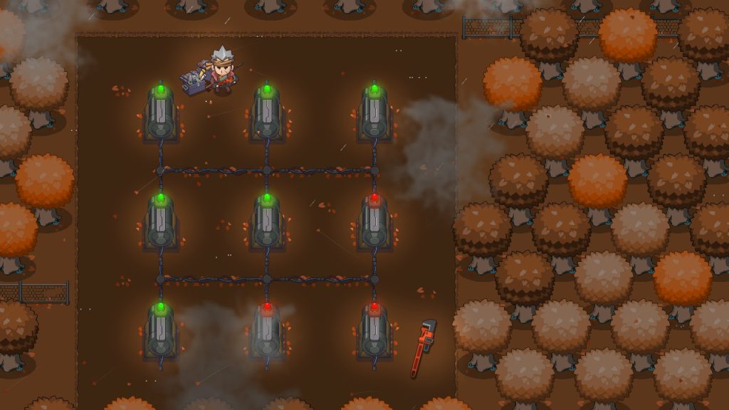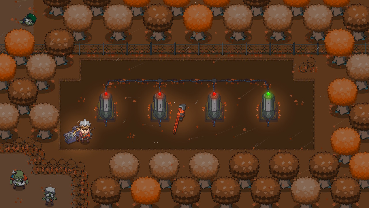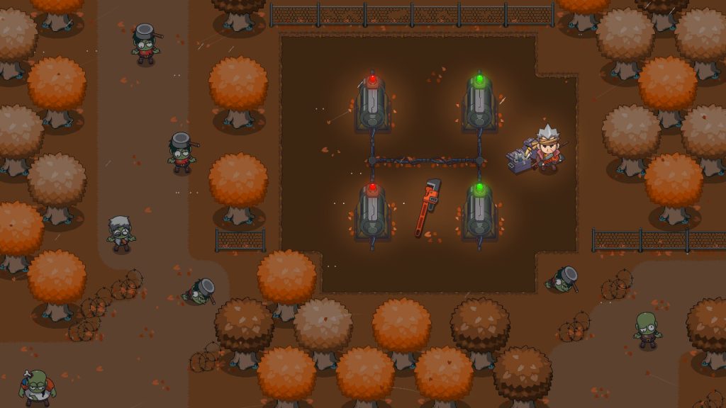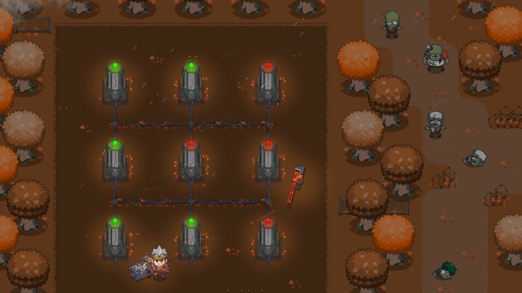 Gameplay is presented from a top-down perspective, with you controlling a wrench-shaped cursor rather than a character directly. Clicking on a generator toggles its state, but also affects any generators adjacent to it, forcing you to think several steps ahead. The objective in every level is the same which is to activate all generators simultaneously. Some stages introduce larger grids or different starting configurations, occasionally reusing layouts with altered activation patterns. Mechanically, the game is clean and functional, but also extremely limited. There are no additional systems layered on top of the core idea, and the zombie theme never meaningfully intersects with the puzzles themselves. Zombies appear occasionally in the background, but they are completely static and serve no mechanical purpose. They don’t interfere, apply pressure, or introduce any sense of urgency, which makes their inclusion feel purely cosmetic.