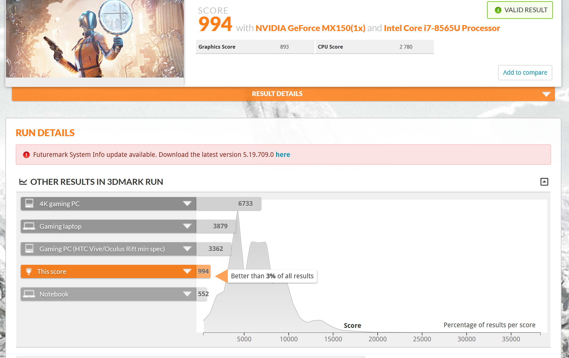 3DMark is a computer benchmarking tool created and developed by UL, (formerly Futuremark), to determine the performance of a computer’s 3D graphic rendering and CPU workload processing capabilities. Running 3DMark produces a 3DMark score, with higher numbers indicating better performance. The 3DMark test scored 994 which puts it above most notebooks that is the market that Huawei are targetting.