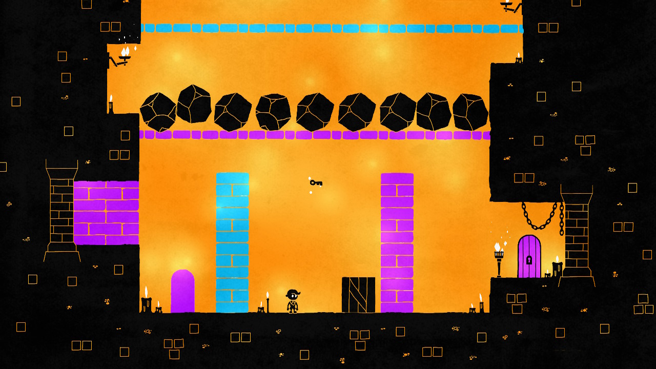 Much like the gameplay, Hue’s graphics may seem rudimentary in screenshots or snippets of gameplay footage, but there’s a certain elegant simplicity to the contrasting visuals and smooth animations that makes Hue a real joy to play. The visuals are reminiscent of the old Game & Watch devices with their stark colours and patterned vignettes that look absolutely fantastic with the bright colours of the background filtering through. The game also runs at a super smooth 60FPS, which makes the animations of the level features and main character look terrific.