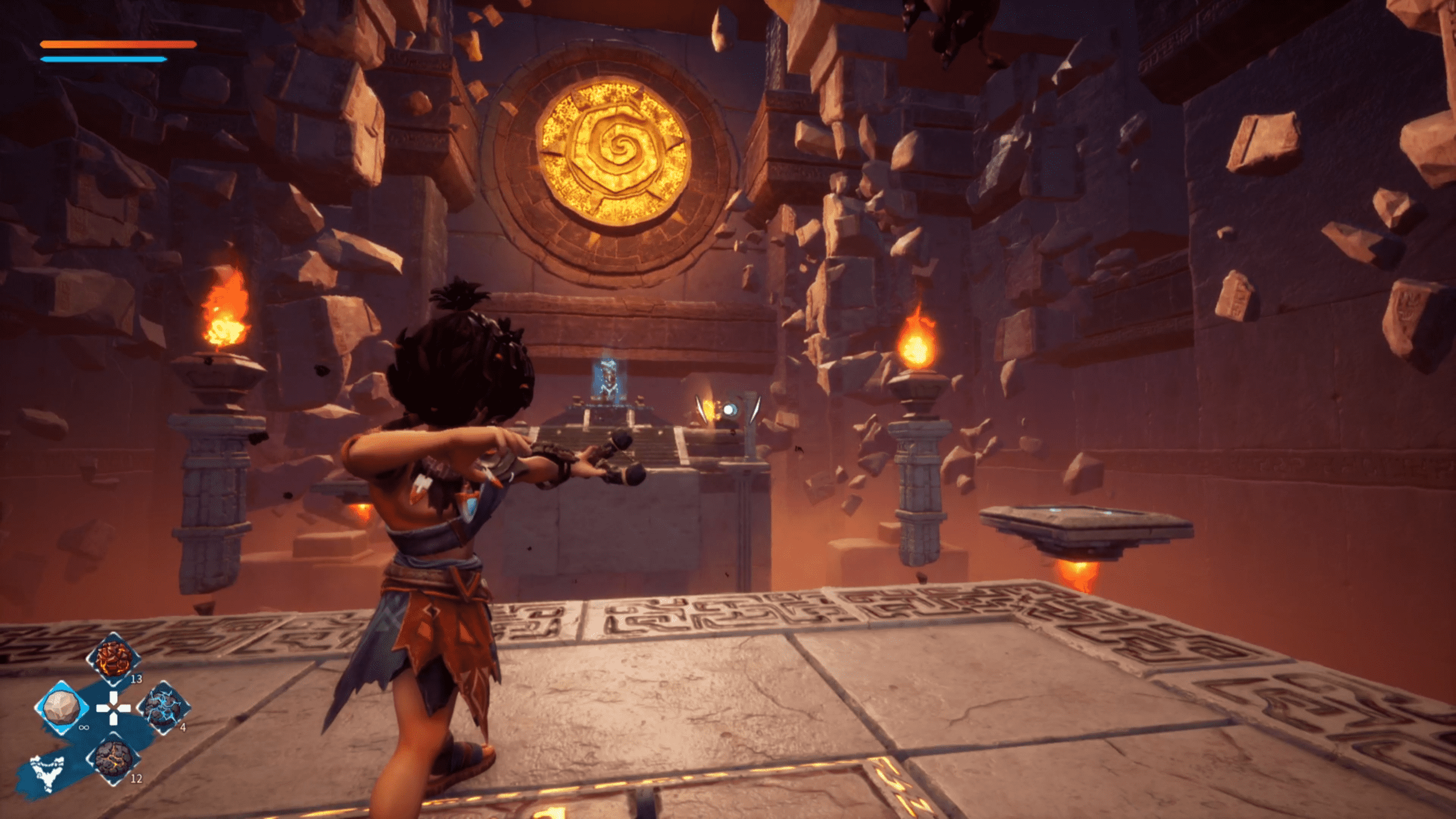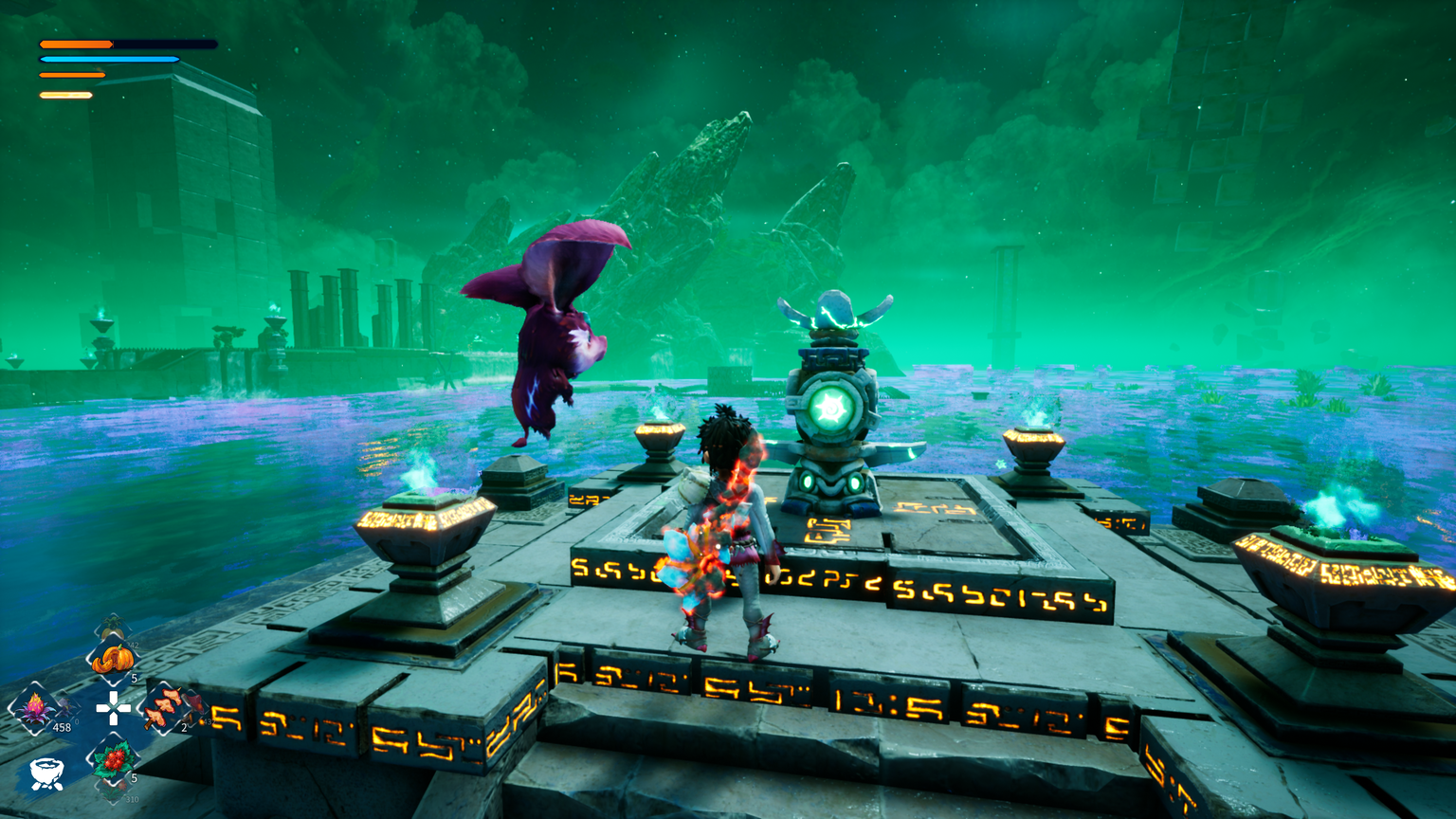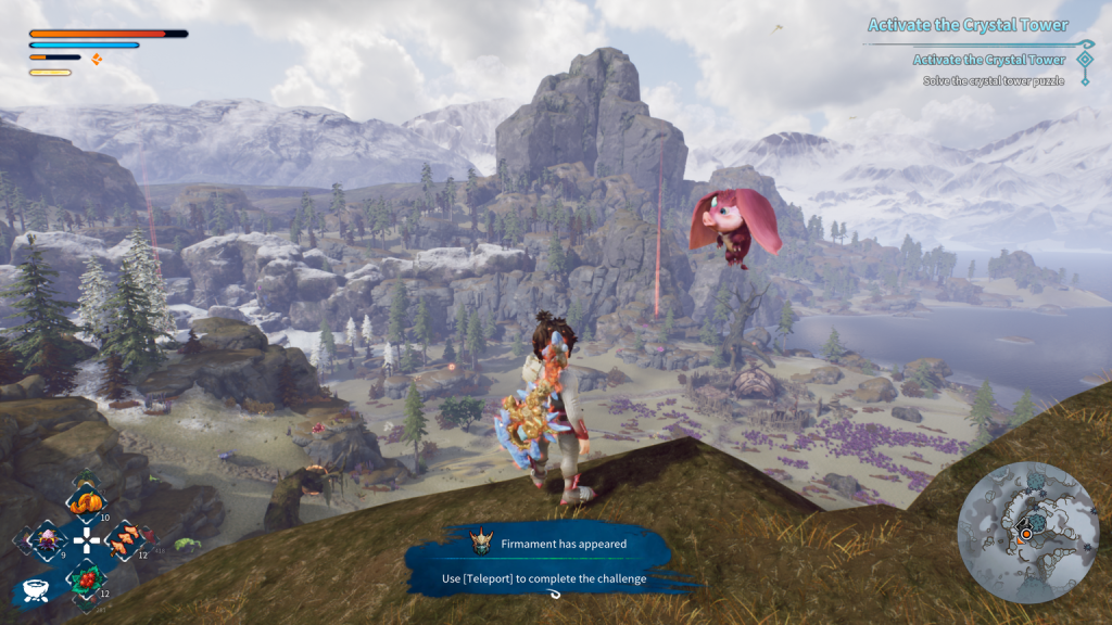 Once the cutscenes end, KAKU: Ancient Seal opens up into a free-form action-adventure that’s surprisingly easy to grasp. The game centers on restoring four elemental regions: Fire, Water, Earth, and Wind, each featuring its own temple to conquer. Outside the floating hub island, each continent is a massive, semi-open zone filled with resources, collectibles, and puzzles. Pumpkins and flowers can be cooked into stat-boosting meals, ores can be crafted into specialized slingshot pellets like fire or poison, and you’ll find towering crystal structures that double as fast travel points once their sliding puzzles are completed. These activities are engaging in short bursts, but after the first quarter of the game, the rhythm barely changes, leading to a creeping sense of repetition.
