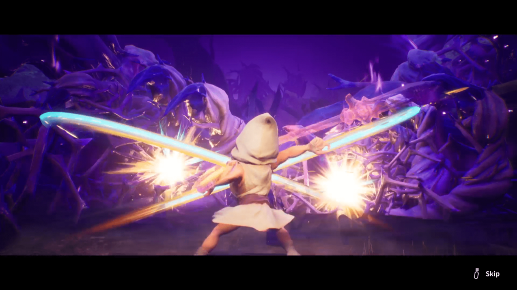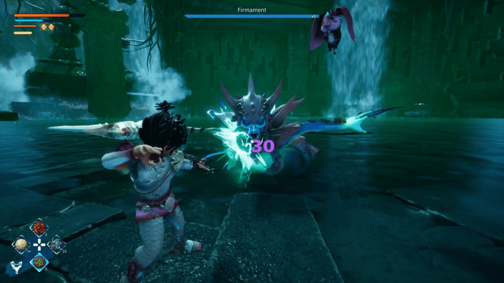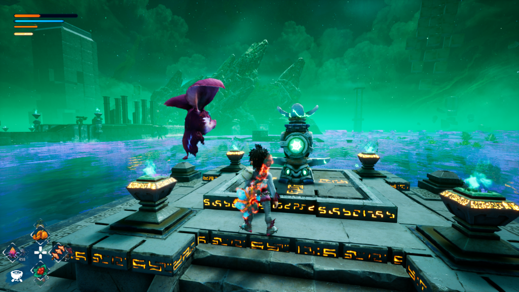A few issues drag the system down: damage feedback is inconsistent, enemy hits sometimes register late, and Kaku’s flinching animations can lock you in place longer than they should. The knockback for Kaku can also be quite annoying when fighting on cliffsides or arenas with pits. Bosses are flashy but often rely on gimmicks rather than evolving patterns, limiting the potential for creativity during battles. Despite a fun range of abilities, it rarely feels necessary to use more than a handful of them. The combat system works, but it lacks the challenge or nuance needed to stay satisfying across the full adventure.
