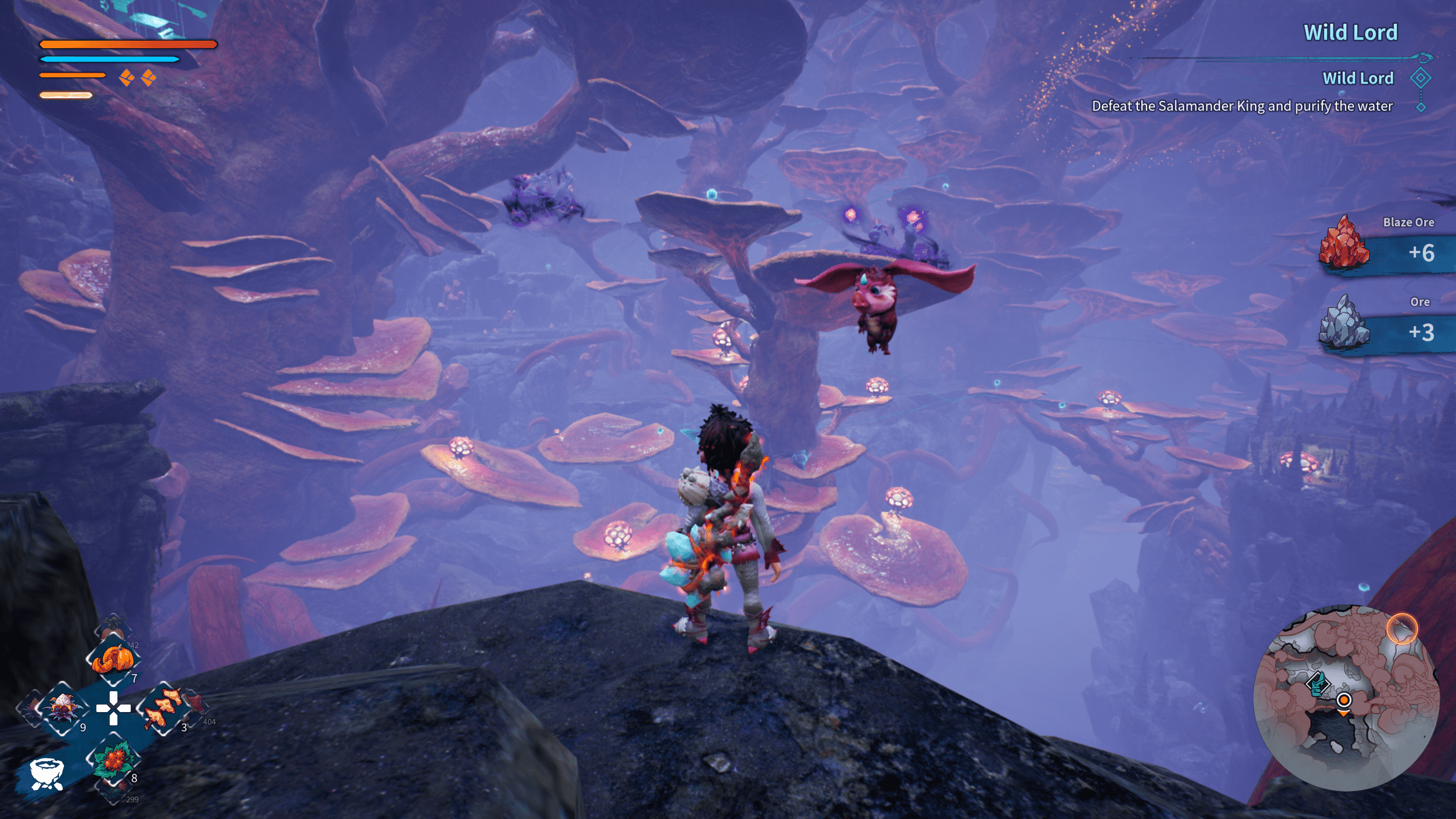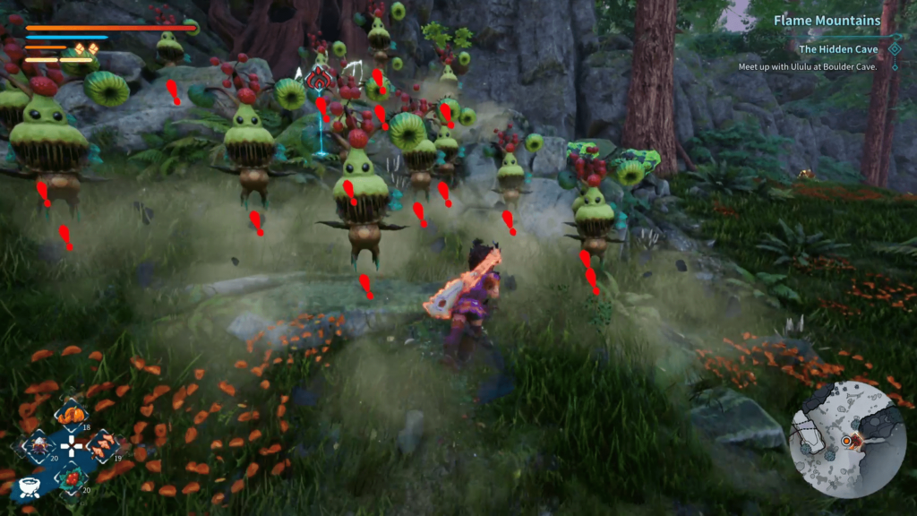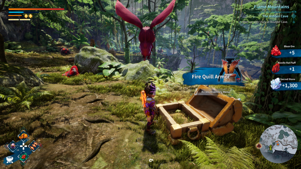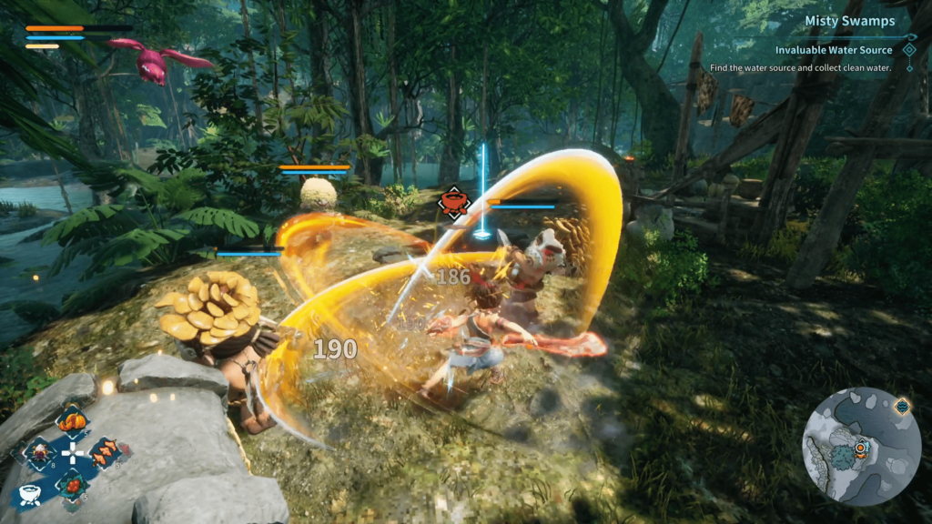 Combat in KAKU starts off tight and deliberate. Every swing of the club has weight, and your slingshot offers flexible ranged options. You can equip different armor sets and headbands, each with passive perks, and slot Rune Stones into your gear for additional buffs like increased stamina recovery or elemental damage. The framework is promising, and early fights, especially against your first major boss, feel well-paced and exciting. But the deeper you get, the easier it becomes to steamroll through most encounters. Sure, it makes sense that things get easier as you level up and find better gear, but the balance swings way too far your way. If you like to explore, you’ll be overpowered by the end of the first world, mowing down enemies in one to three hits. Even with average gear, combat rarely feels like a real threat with the plethora of abilities you can possess right off the bat if you level up.