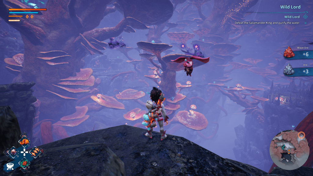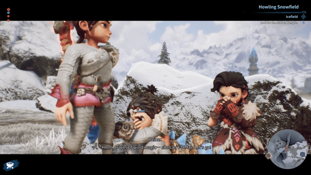 Visually, KAKU: Ancient Seal is impressive. The art direction leans heavily into vibrant, cartoonish designs that fit the prehistoric fantasy setting perfectly. The elemental regions each have their own mood. The fiery volcano region bursts with molten reds, the swamp is dense and misty, and the snowfields feel vast and quiet. Lighting and shadow work are especially strong, with striking vistas that give the world a sense of scale and wonder. Enemy designs, while occasionally repetitive, are colorful and memorable. I did come across a bunch of slowdown, pop-in, and other odd things like characters disappearing for a second during cutscenes or even characters not showing up at all, but other than these typical gaming hiccups, the game runs fairly well overall.
