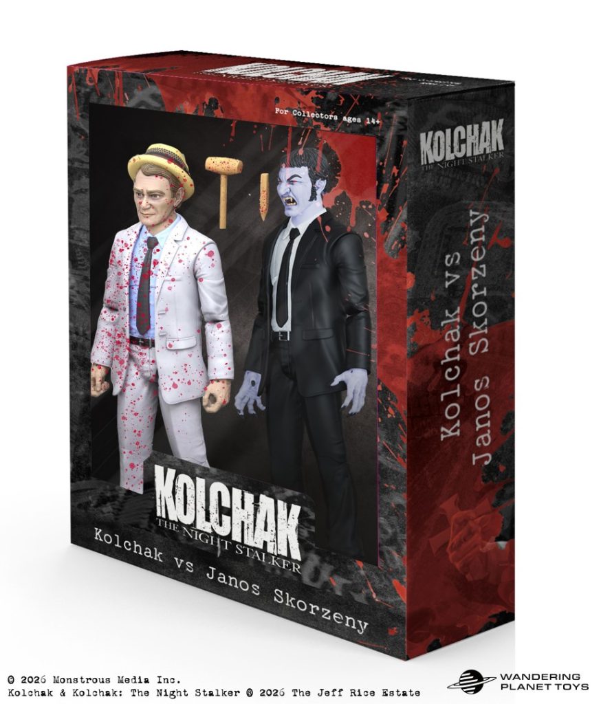 4. The two-figure “Blood-Splattered Kolchak vs. The Night Stalker” pack recreates one of the most memorable confrontations in horror TV history. What was your approach to designing Janos Skorzeny, and how did you balance authenticity with modern figure expectations?