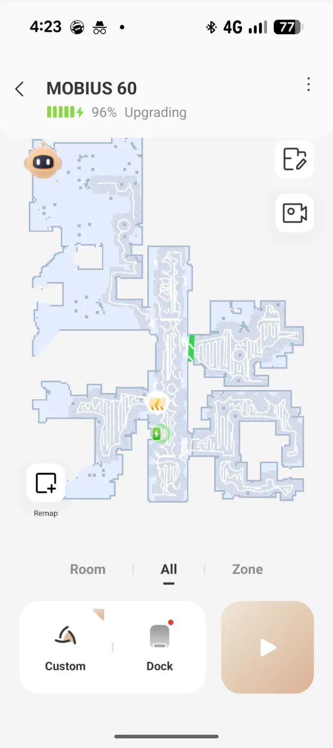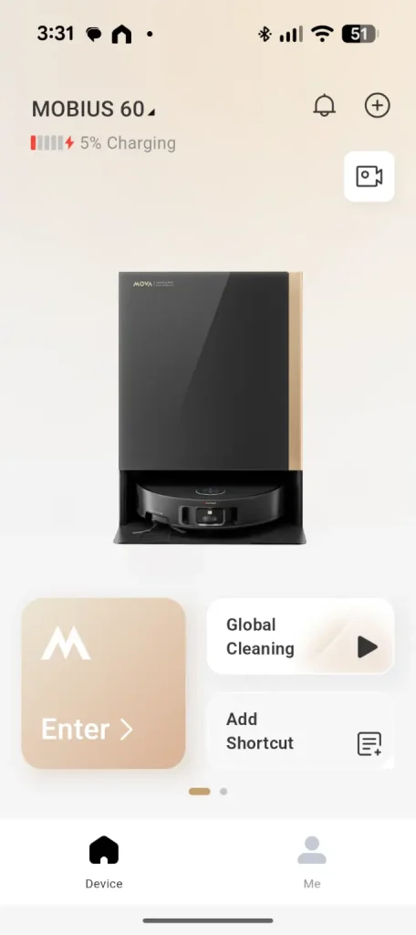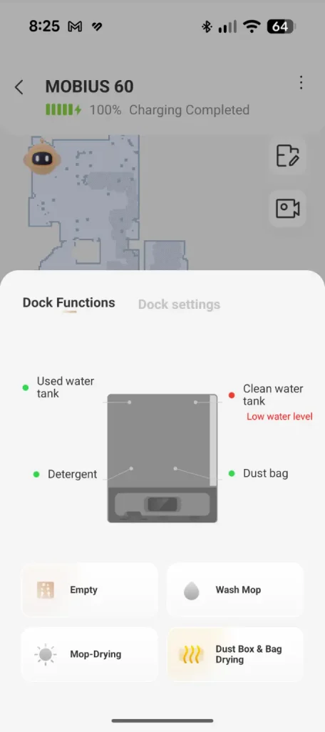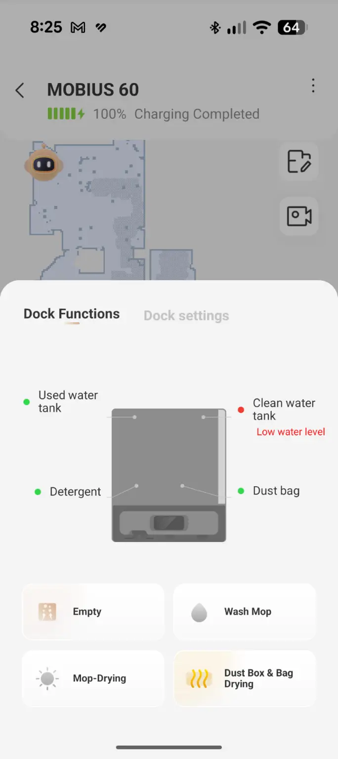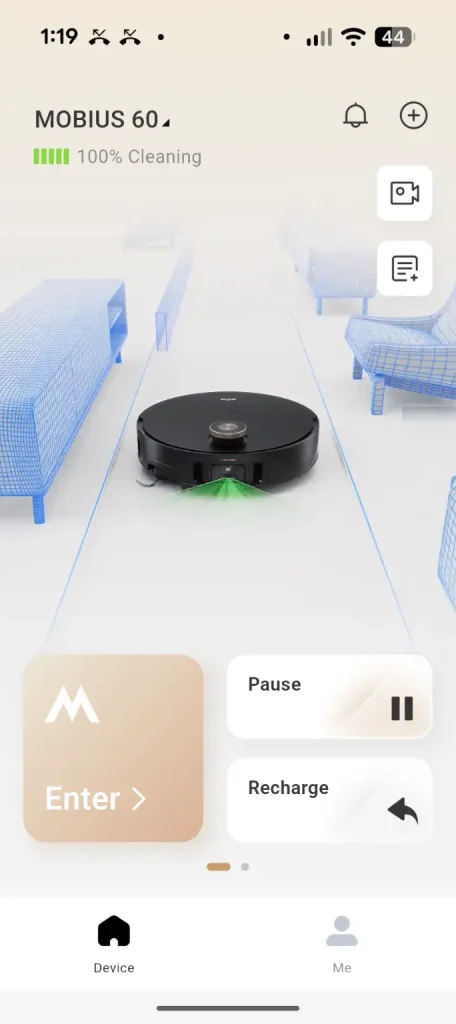The app is central to the Mobius 60 experience allowing scheduling, suction adjustments and mop pad selection. The integrated camera offers live monitoring (it must be enabled via a pin for privacy) so users can check progress or view their home remotely. Controls are intuitive with options to designate restricted areas or direct the robot to specific zones and the app sends alerts when maintenance is required, making management seamless.