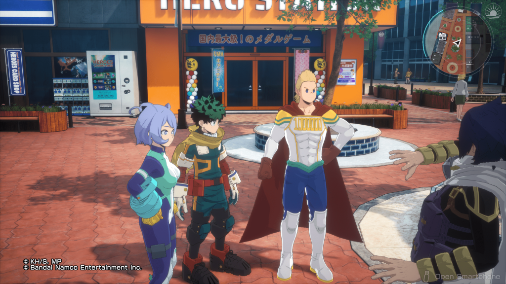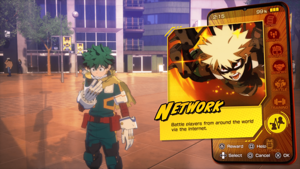Outside of pure combat, All’s Justice is packed with modes and systems. The game opens in the Main Stage, a small city hub that acts as both a menu and a playable space. You can run around, talk to characters, trigger battles, enter buildings like the gym for training and free battles, or visit shops to customize UI elements, costumes, and color variations. Deku’s smartphone also functions as a quick menu, letting you jump into any mode instantly if you prefer efficiency over exploration.