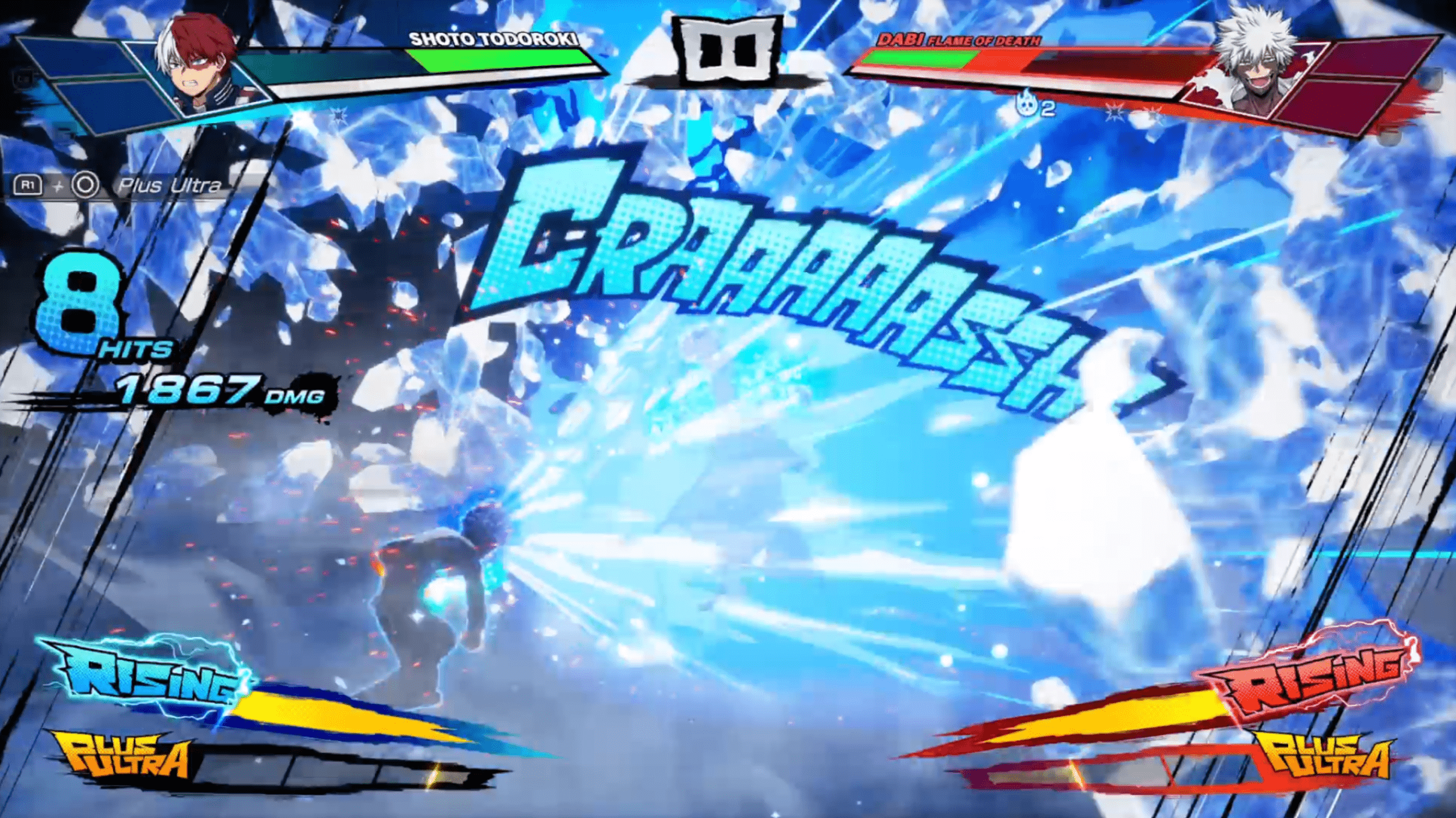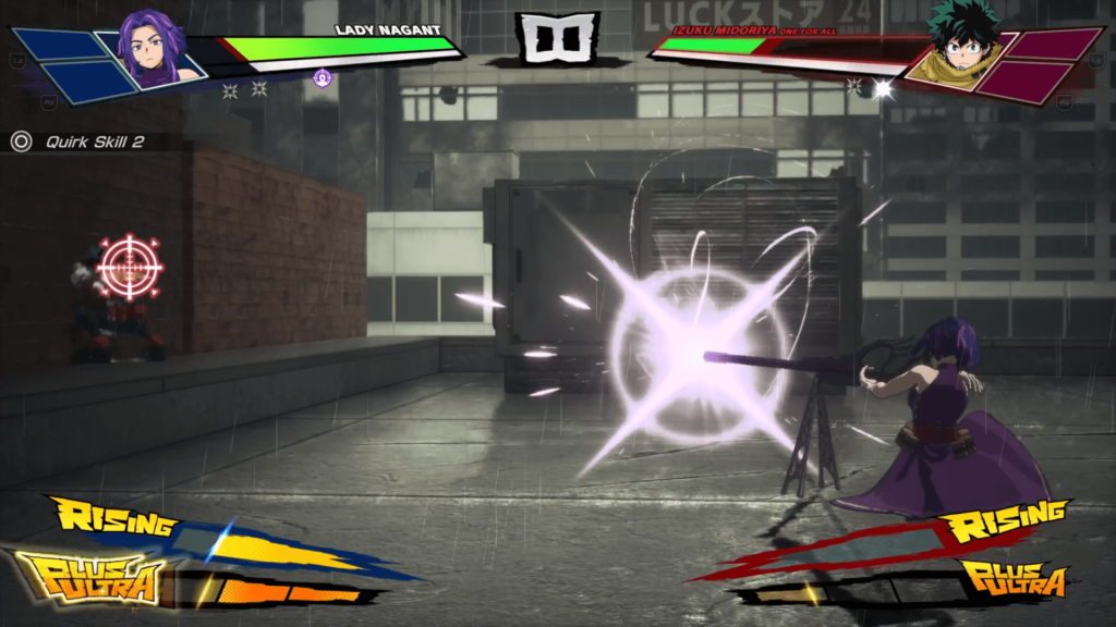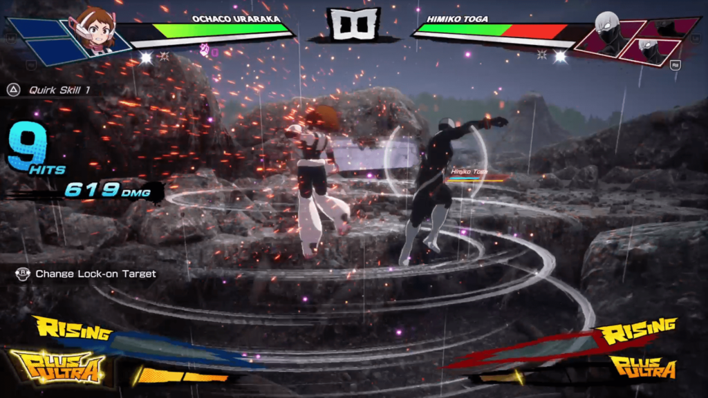 Each character feels distinct, which is critical for a series with such a massive cast. Quirks are not just visual flair but directly inform how each fighter controls, moves, and pressures opponents. Triangle and circle inputs combined with directional movement unlock different ground and air based Quirk skills, while Rising mode temporarily boosts attack power, movement speed, and special properties once its gauge is filled. The Plus Ultra gauge stores up to three stocks and allows for powerful ultimate attacks or character specific effects, adding another strategic layer. Guarding, directional dodging, emergency escapes, and Counter Crash mechanics all contribute to a combat system that rewards awareness and practice rather than button mashing.