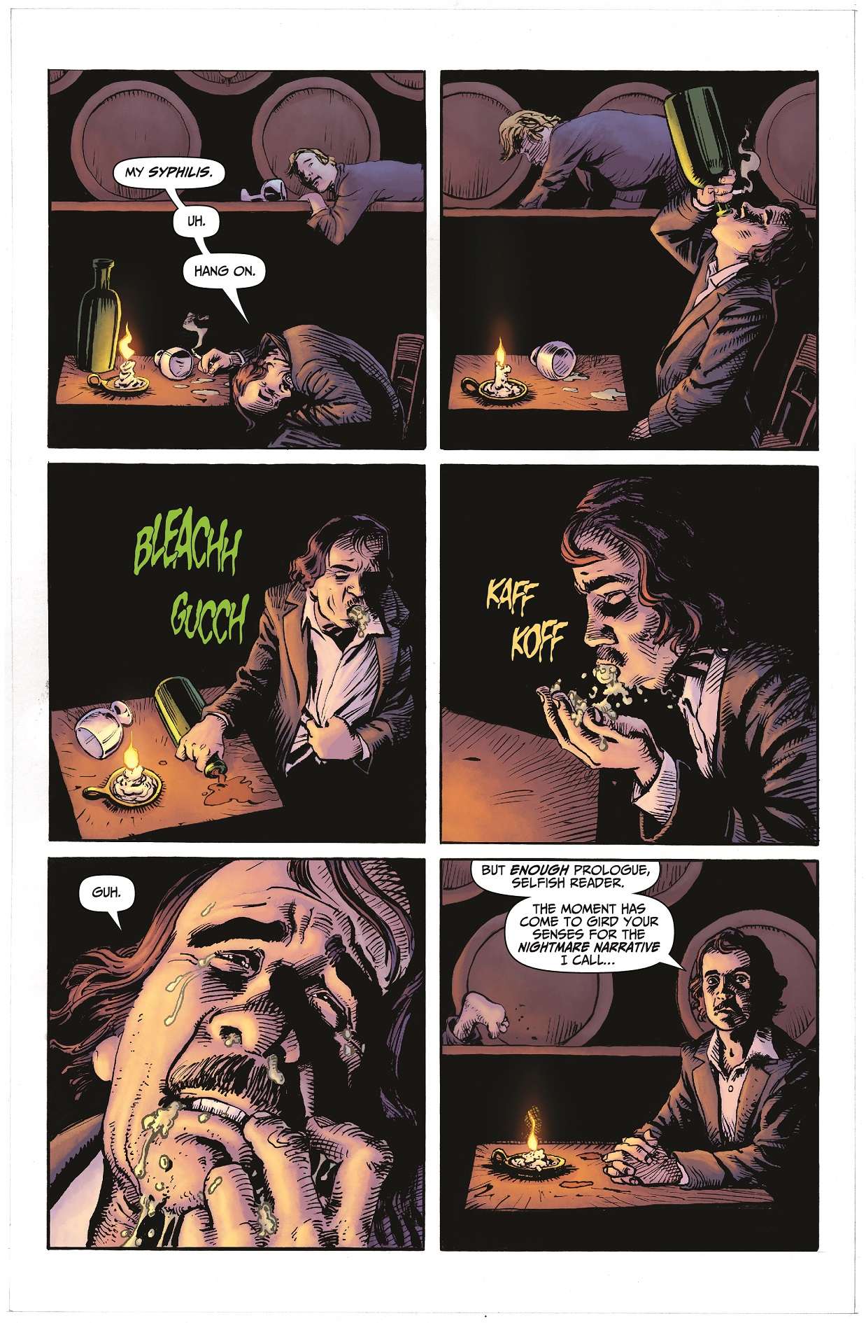 The first story is a retelling of one of Poe’s short stories, The Facts in the Case of M. Valdemar. Some may know this story already, but for those who don’t it’s about a man, M. Valdemar, who is put in a suspended hypnotic state directly at the moment of his death. The man is technically dead, however, lingers on in this tormented state for seven months, whereupon he is released from his hypnoses, only to immediately decay into a putrid pile of goop…wonderful! Writer, Tom Peyer has added his own flair to this story, turning Valdemar into a well-renowned pastry chef. The climactic finale, which unfolds in front of Queen Victoria herself was like that excellent scene involving Mr. Creosote from Monty Python’s The Meaning of Life…if you’ve seen the movie, you’ll know what I’m talking about. It’s wonderfully grotesque and Fred Harper’s art perfectly captures all of the gory details perfectly. I loved every moment of it. Bravo guys!