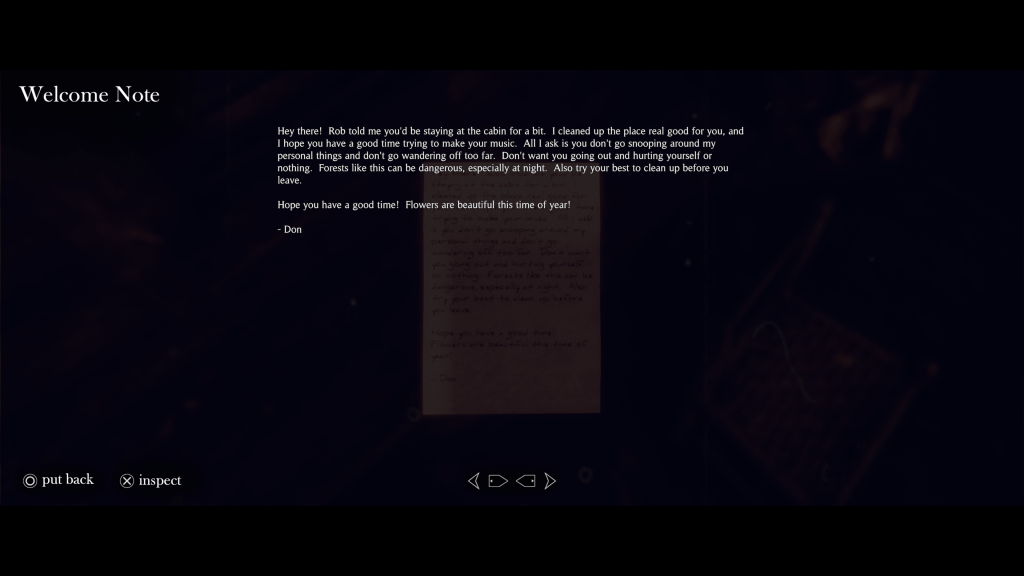 You step into the role of Dakota, a musician from the band Neon Songbird who is struggling with both creative burnout and personal trauma. After attempts to reshape the band’s sound fail to gain traction, Dakota retreats to a remote log cabin in the mountains of West Virginia for a month with the hope of clearing their head and finishing a new album. What starts as a quiet creative retreat slowly becomes something much stranger. The cabin and the surrounding woods seem to push Dakota into a surreal dreamlike state where buried emotions begin to manifest in physical and symbolic ways. As the days pass, Dakota is forced to confront memories and anxieties that take the form of hostile creatures and shifting dream worlds.