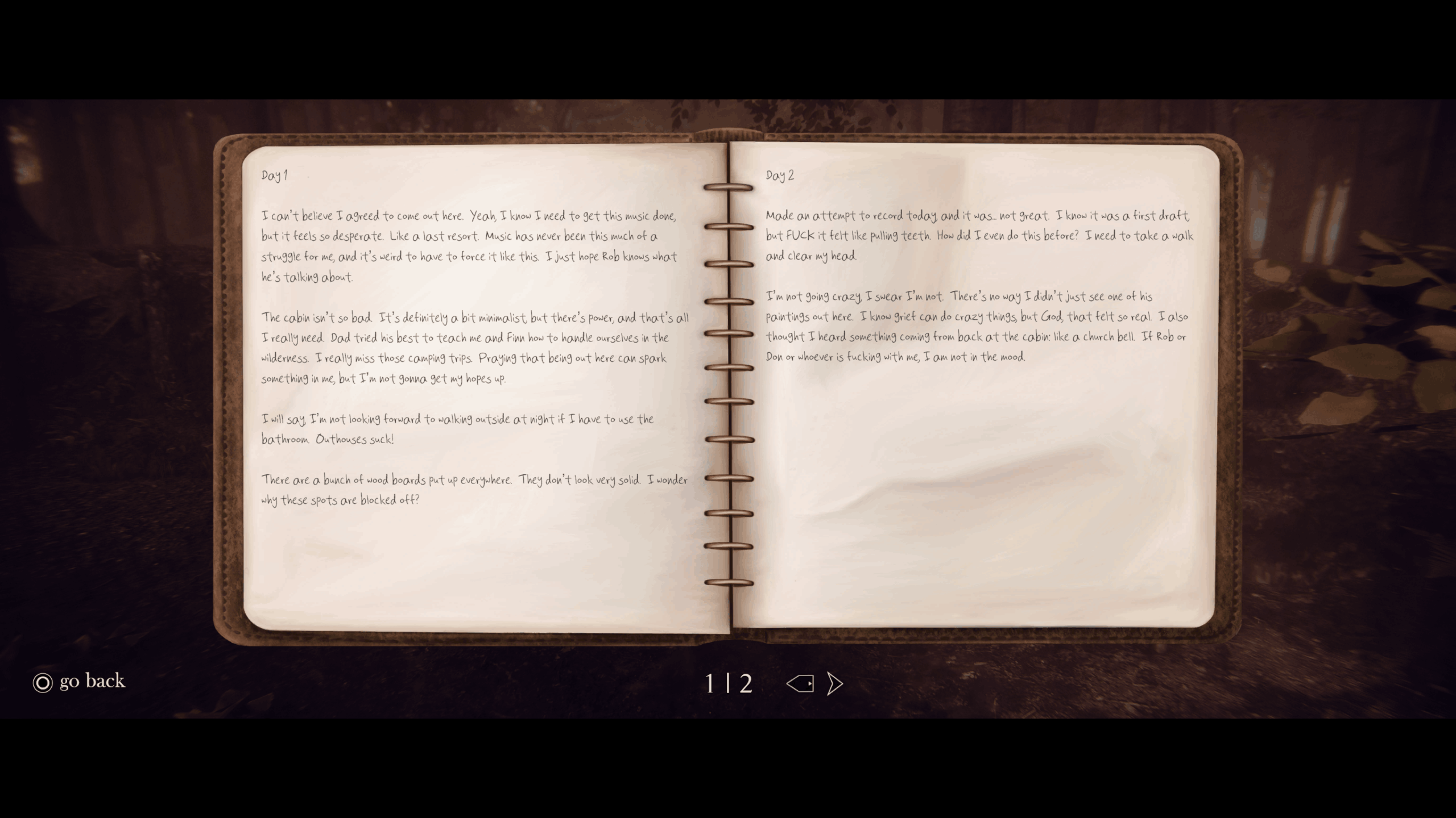 Once the actual game begins, things settle into a more traditional structure. As Dakota, you can run, crouch, perform quick turns, and interact with objects around the environment to solve puzzles. Much of the early gameplay focuses on exploring the wooded area around the cabin and taking care of small tasks that support Dakota’s creative process. A field recorder lets you capture environmental sounds like a woodpecker tapping against a tree, water dripping into a puddle, or a frog croaking in the distance. These sounds serve as inspiration for Dakota’s music, tying the gameplay directly into the character’s artistic struggles. You also stay in contact with Dakota’s manager Rob through a radio, which helps guide your progress while adding a personal touch to the story.